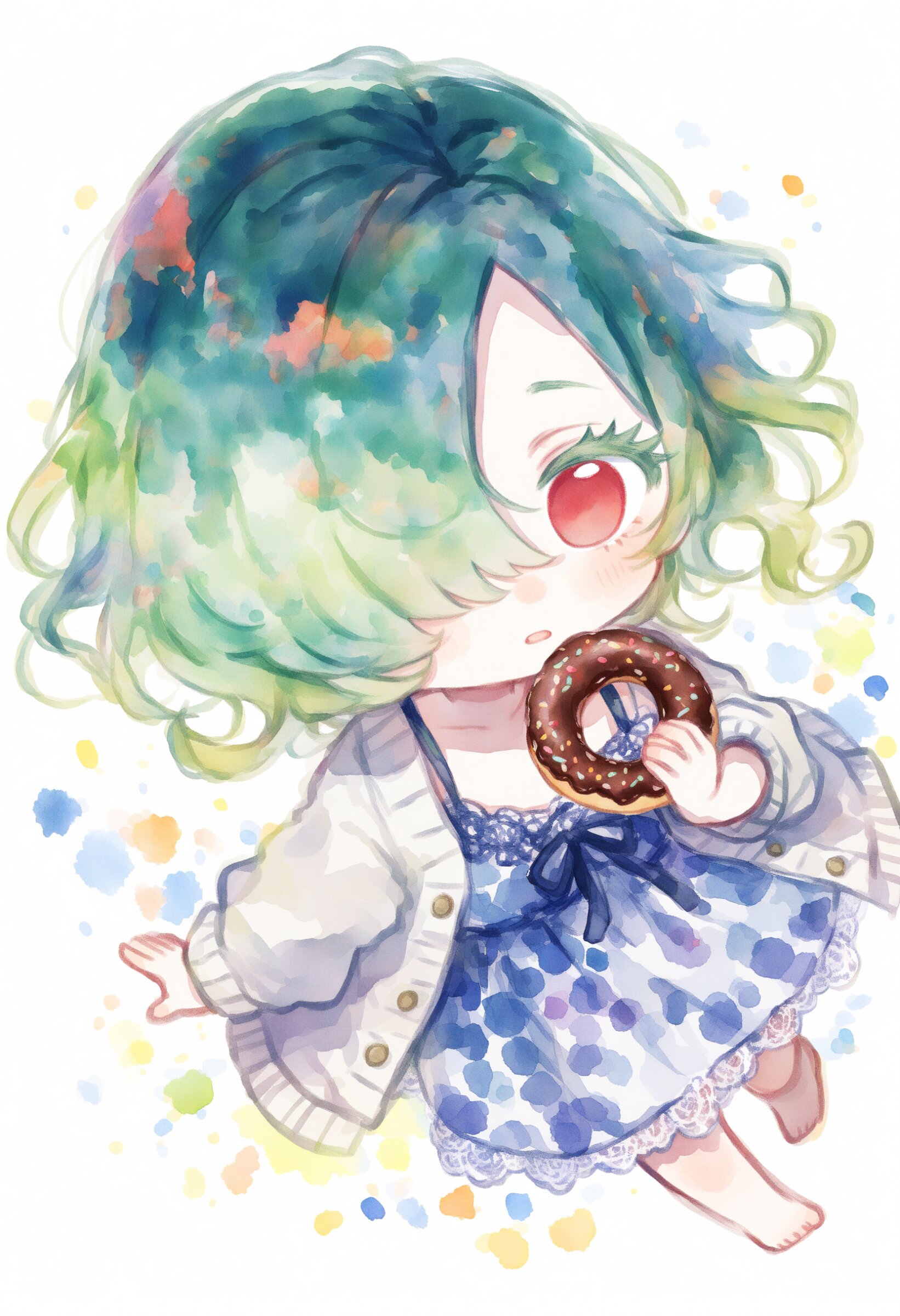 deformed chibi, watercolor, Solo, cute face, green hair, blue gradient_hair, medium short hair, [wavy hair], (((hair over one eye))), red eye, No pupils tareme Jitome clear eyes colored_eyelashes pale skin (holding Donut to Many Donut) oversize Food chocolate_donut parted Lips hand up frill lace open cardigan oversize clothes White cardigan White negligee barefoot (Donut pattern background) [White background] Dutch angle from above dynamic angle contrapposto