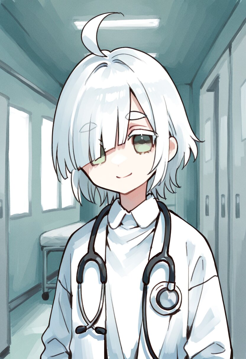 <lora:inmnstyleilxl:0.9>, best quality, masterpiece, very aesthetic, watercolor painting, general, 1girl, chibi, solo, (bright white hair), short hair, blunt bangs, white thick eyebrow, white colored eyelashes, (hair over one eye), ahoge, mintgreen eyes, doctor costume, over size white coat, stethoscope, smile, examination room, upper body