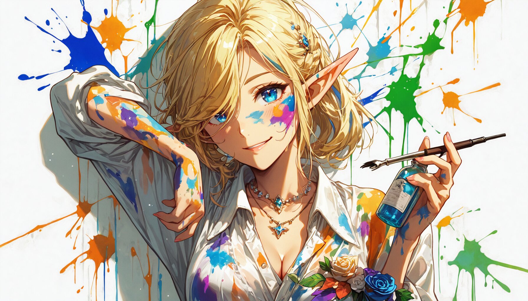 映画のポスターの様なイラスト。映画のラストシーンの様な構図と情景。オフィシャルアート。日本のアニメの画風でセミリアルなクールヒロイン。グラマラスで金髪碧眼のエルフ少女。大きな白い壁にペンキでカラフルなポップアートを描く。彼女は服や顔にペンキの飛沫がかかりながら満足げな笑顔で私を見つめている。