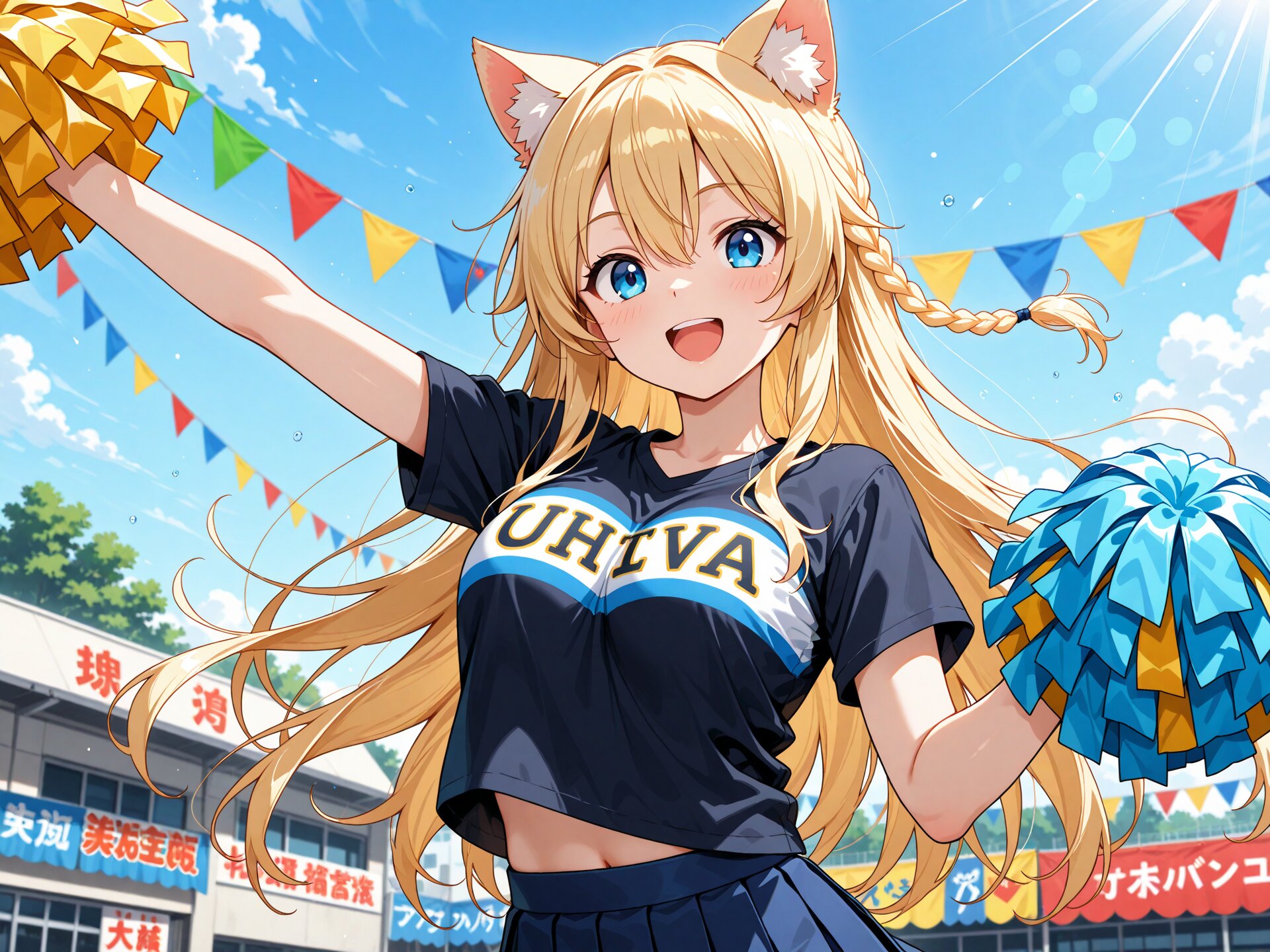 (masterpiece, best quality, ultra-detailed, anime style), 1girl, blue eyes, long hair, blonde hair, braid, blonde cat ears, hair between eyes, large breasts, upper body, open mouth, :d, big smile, cute pose, pom pom (cheerleading), dynamic pose, dancing, black t-shirt, navy blue pleated skirt, blue sky, cowboy Shot, school festival setting, school building, decorated stalls, warm festival lights, colorful banners, soft sunlight, lively mood, blurred background,