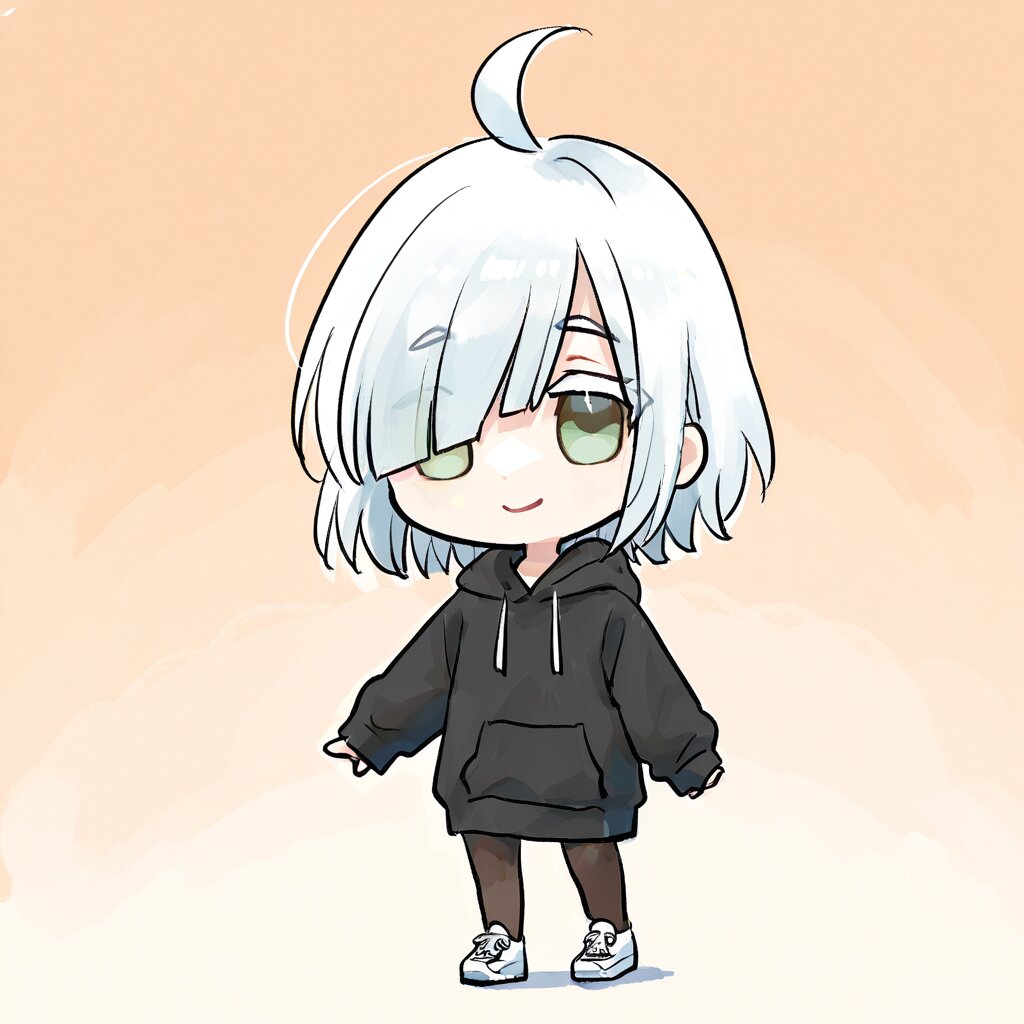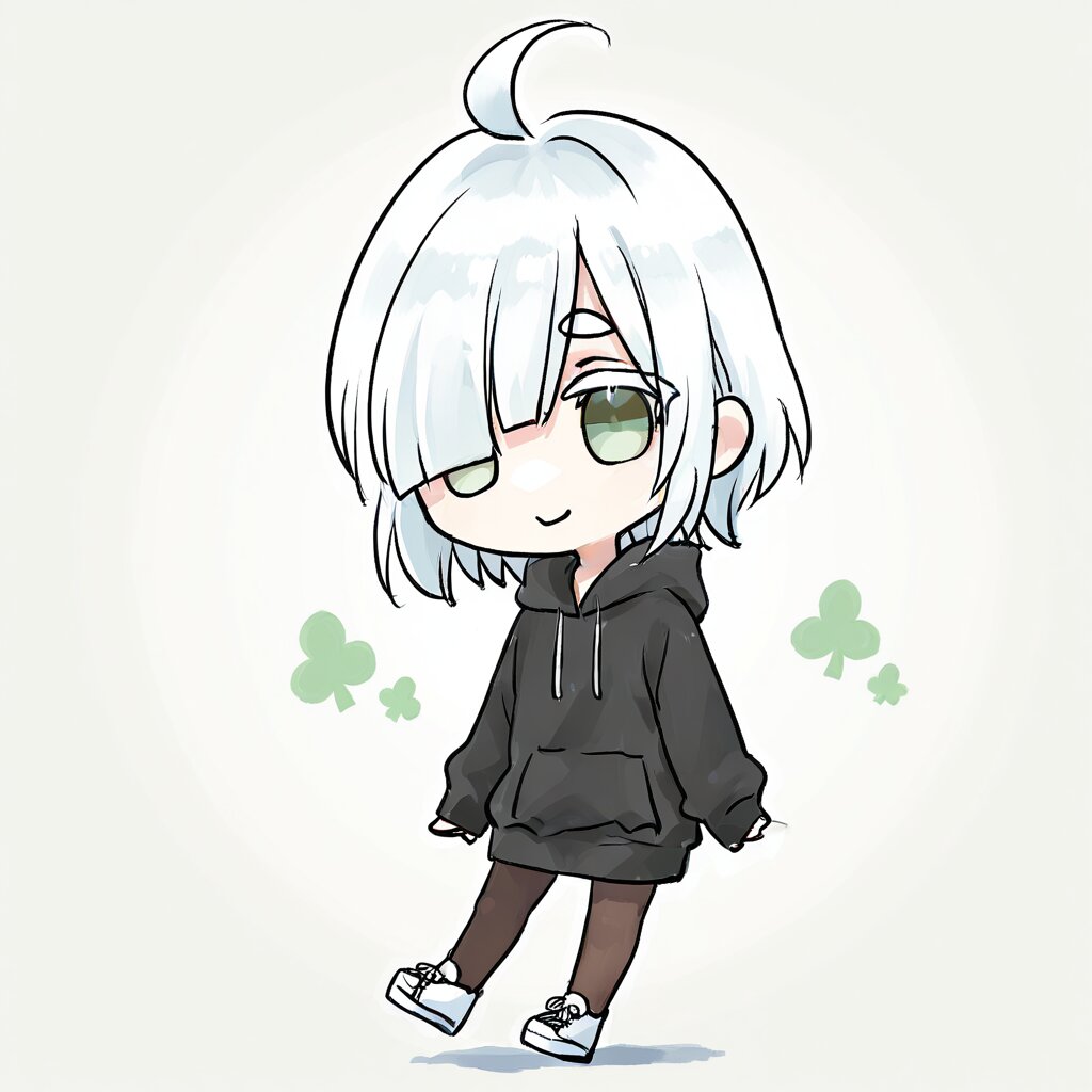 <lora:inmnstyleilxl:0.9>, best quality, masterpiece, very aesthetic, watercolor painting, general, 1girl, solo, (chibi:1.4), (bright white hair), short hair, blunt bangs, white thick eyebrow, white colored eyelashes, (hair over one eye), ahoge, mintgreen eyes, oversize black hoodie, sleeves past wrists, brown tights, white sneaker, smile
