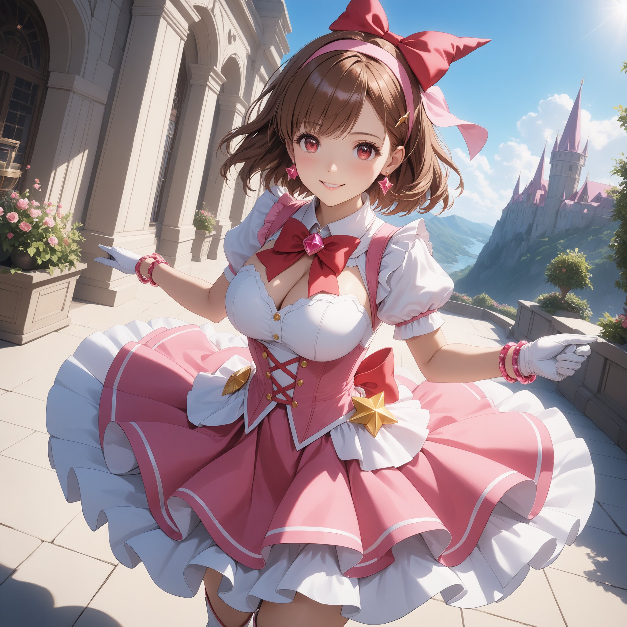 masterpiece, best quality, photorealistic, sharp focus, cinematic lighting, depth of field, beautiful composition, vibrant colors, ultra high res, 8K, highly detailed, masterpiece, best quality, very detailed, masterpiece, best quality, 1girl, solo, red eyes, brown hair, Cure Miracle outfit, magical girl, hair bow, red bow, mini witch hat, pink hairband, earrings, white shirt, red bowtie, puffy short sleeves, pink corset, pink skirt, layered skirt, bracelet, white gloves, knee boots, white boots, pink high heels, cute pose, outdoors, blue sky, smile, large breasts