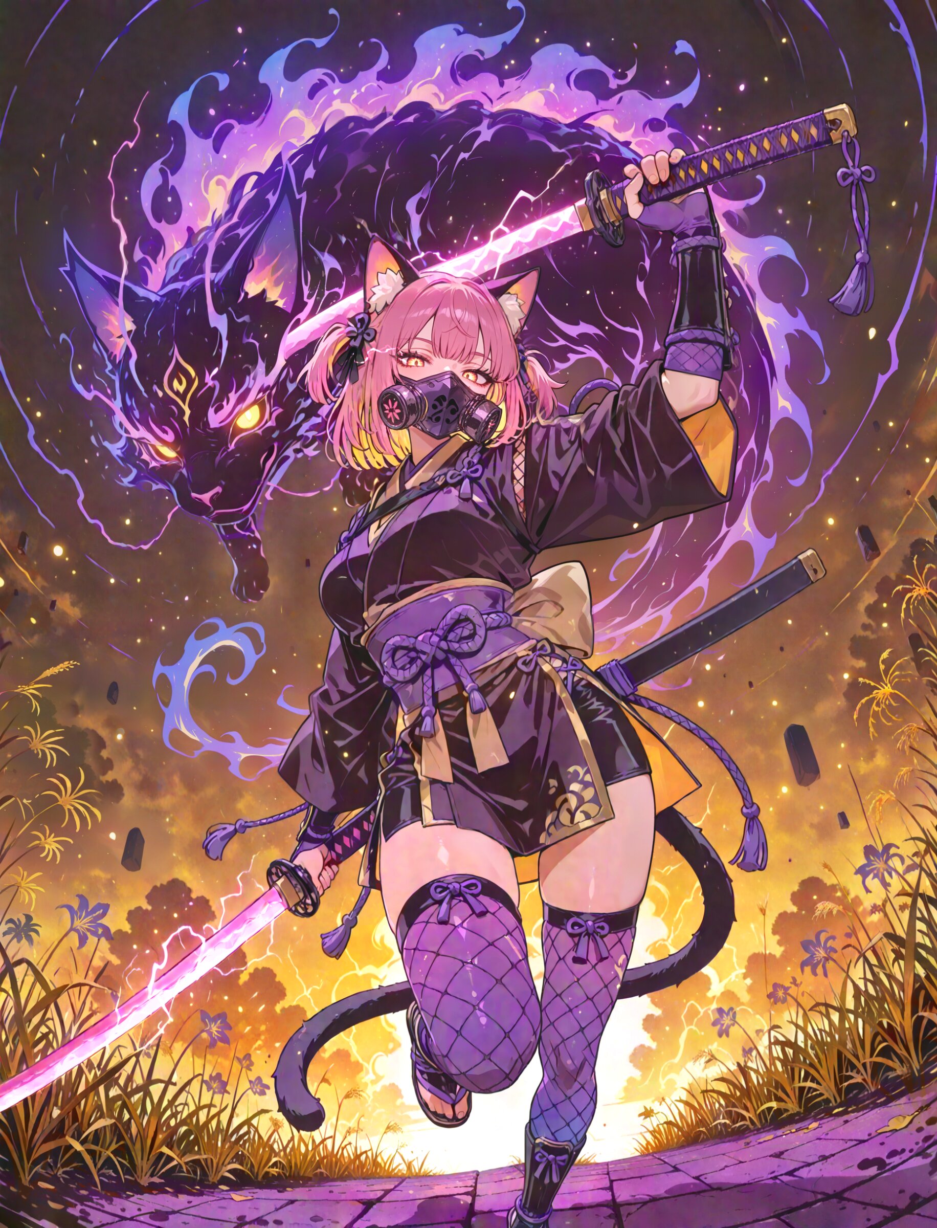 from front, (fisheye,fisheye lens angle:1.0), (low angle shot:1.15) looking at viewer, (dutch angle:1.2), autumn atmosphere, earthy color, glowing purple cat energy, purple silhouette of serious cat guardian, huge cat aura, 1girl, samurai, (muscular female:0.65), pink hair, yellow colored inner hair, chest length hair, two side up double-parted bangs , soft hair, glowing eyes, eye trail, beautiful beige eyes beautiful breasts, ,, ninja cloth, short kimono, obijime, fishnet inner, fishnets, fishnet thighhighs, ninja pants,, kote, (ninjutsu:1.1), (holding scroll:1.1) mask around neck, respirator, , hazel brown scarf,, zouri, , cat ears, cat tail, ,, japanese clothes, seductive smile, dynamic pose, kung fu attack, kung fu action, kuji-in, ninjutsu, multiple weapons , raijin, lightning (swirling ink effects:1.2) jumping, midair, flexing, beautiful metallic luster, sharp katana, ultra detailed katana, silver particles, light trail, The background is a solid, bright purple, creating a striking contrast with the intricate, multi-colored design of the character, (fighting silhouette:0.0), pop color background, (high saturation:1.2), drop shadow, ink-drenched shadows, solid black shadow blocks, abstract ink swath background, heavy chiaroscuro, high-contrast inky shading, negative space, grunge texture, calligraphic strokes, susuki grass, super fine concept art, hard surface, graceful eyes, masterpiece, best quality, amazing quality, very aesthetic, absurdres, newest, professional art lots of details, , overexposure, sumie effect style, 4ur4_illu,shiny, glowing, glowing particles, glowing light particles, light particles, spark, <lora:noline (1):-0.5> <lora:sdxl2-flat2-512b:0.2> <lora:facelightup_xl_v10:0.5> <lora:V2_yakumo_alchemy:0.5> <lora:Aura_illu:0.1>
