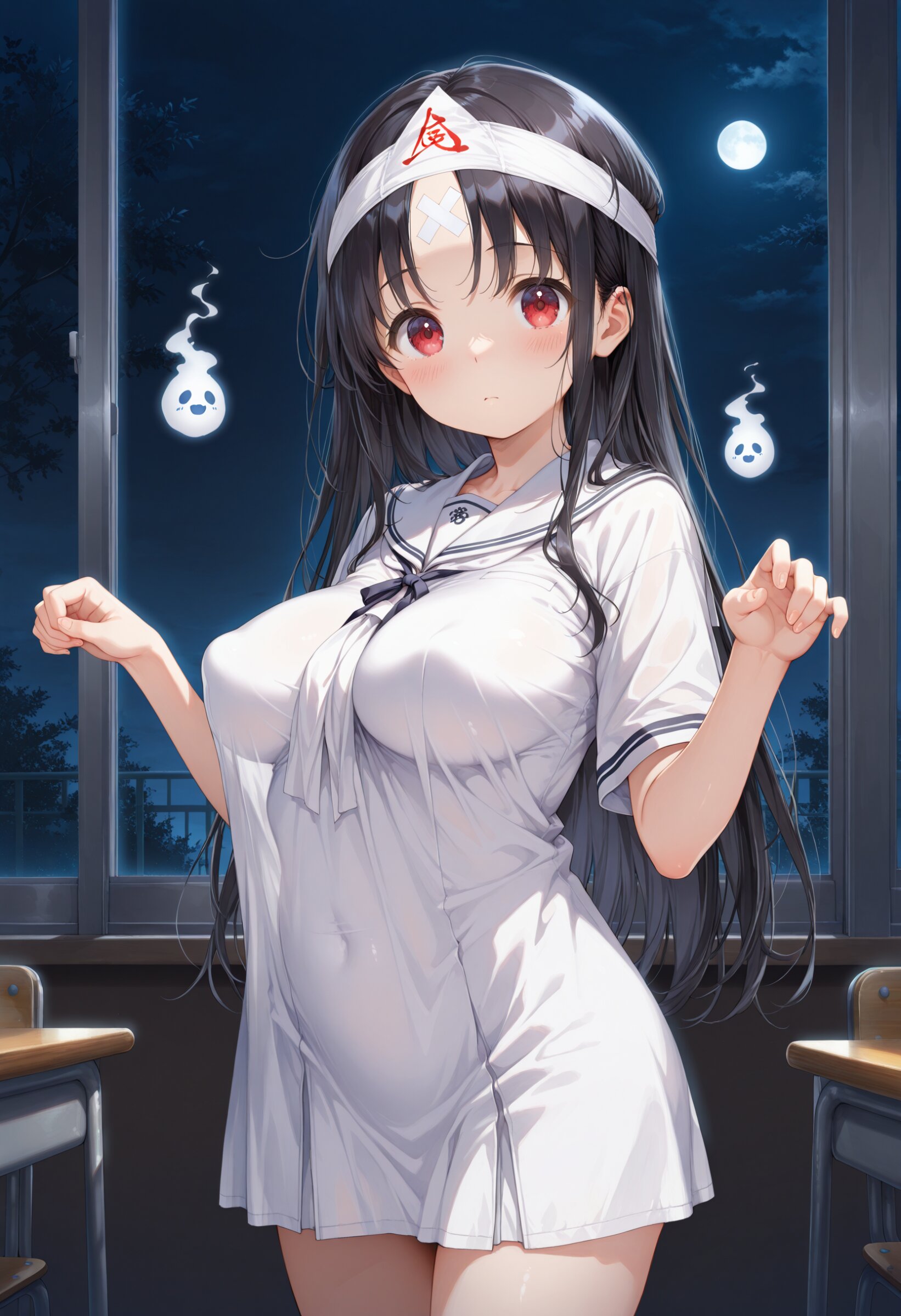 masterpiece, best quality, amazing quality, general, fine detail, official art, 1girl, loli, long black hair, shiroshozoku, japanese white clothing, a triangular white cloth on the Forehead, big breasts, impossible clothes, (perky breasts:1.2), ghost pose, night, dark school classroom, dark background, cowboy shot,