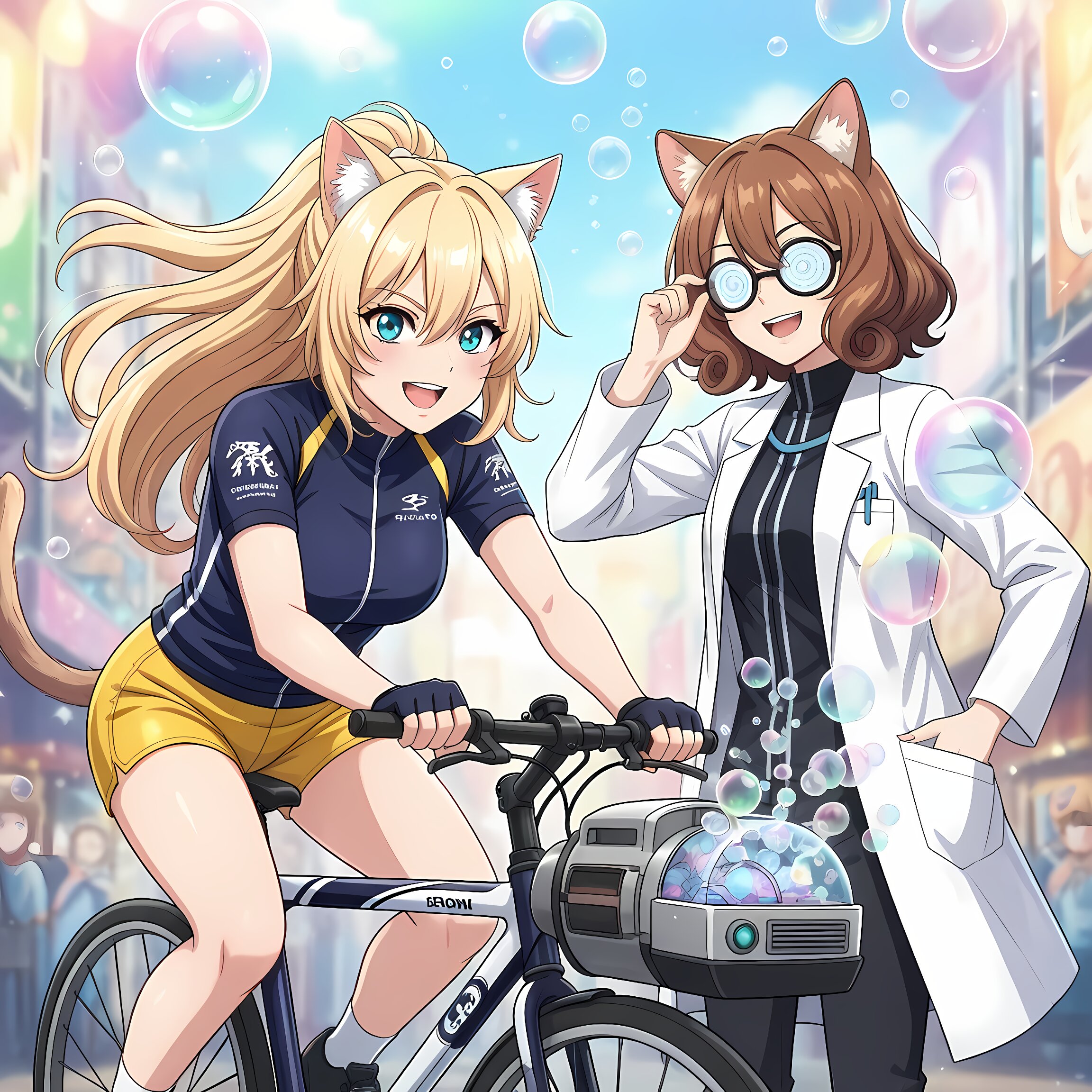 a sporty athletic girl pedaling a bicycle generator with strong energy, her posture dynamic and focused. beside her stands a scientist-like character in a white lab coat with spiral glasses, making a glasses push-up pose. the bicycle generator powers a bubble machine releasing glowing rainbow-colored bubbles. colorful bubbles float upward in various sizes, illuminating the scene with soft rainbow light. lively and vibrant festival atmosphere, anime illustration style, clear details, soft lighting.
