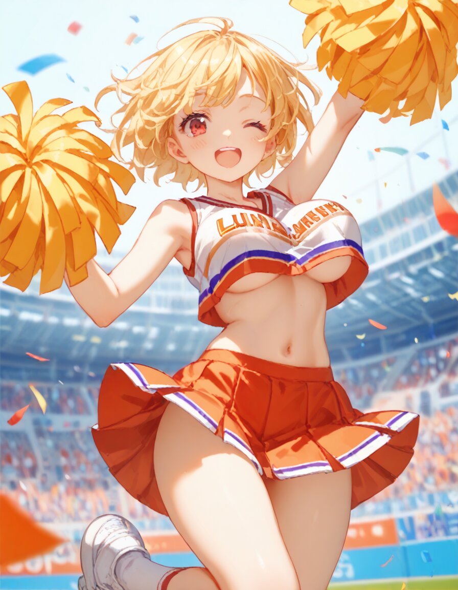 score_9, score_8_up, score_7_up, score_6_up, score_5_up, score_4_up, source_anime BREAK 1girl, solo, short hair, blonde hair, straight hair, red eyes, large breasts, smooth skin, cheerleader, pom pom \(cheerleading\), happy, one eye closed, open mouth, arm up, leg up