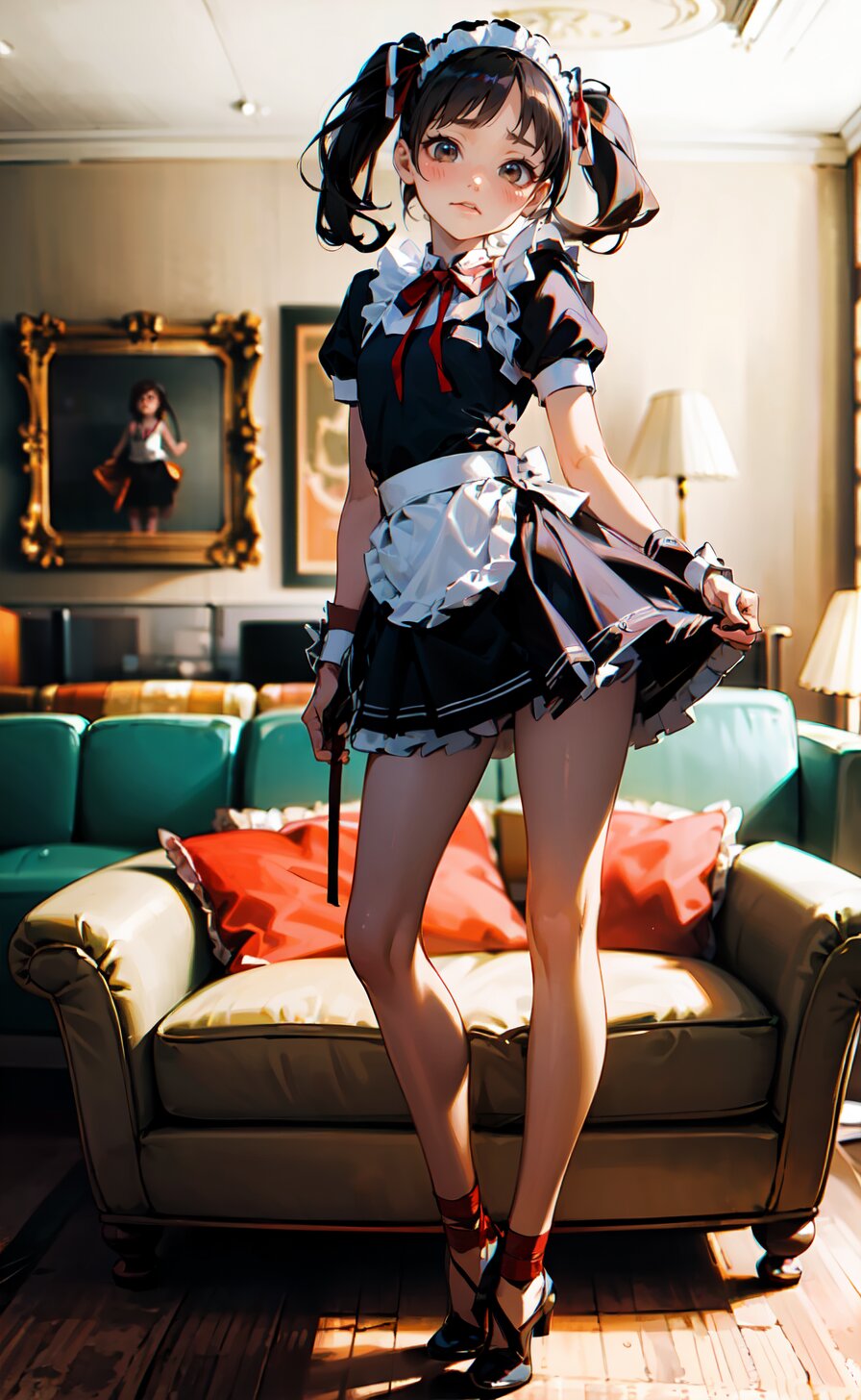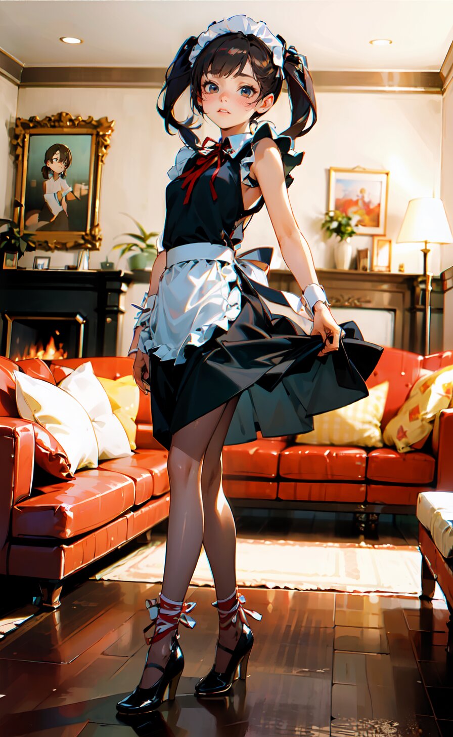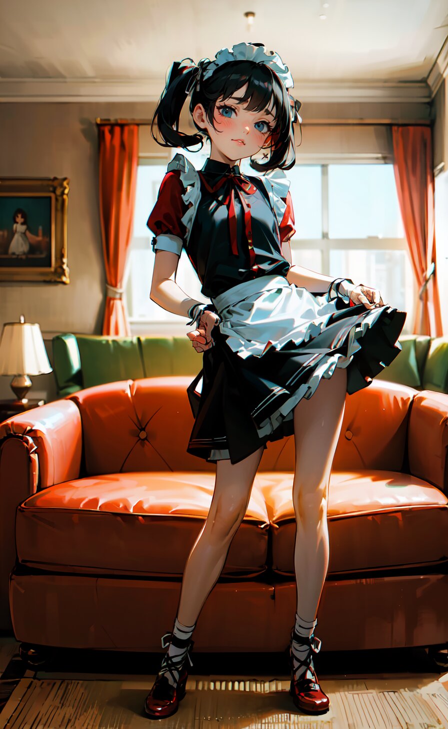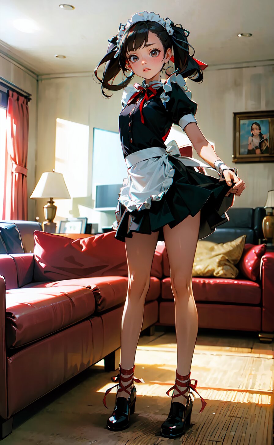 (8k, best quality, masterpiece:1), (realistic, photo-realistic:1.4), (sexy posing, from front: 1.6), 1girl, 12 years, french maid, looking away, (full body:1.8), (((complete flat chest))), beautiful detailed face, perfect skin, detailed skin texture, (twintails with ribbon, red French Elegant Sissy Mini Maid Dresses: 1.6), (an extremely delicate and beautiful hands), (in the bright livingroom: 1.6), <lora:yuduki_v01:0.6>