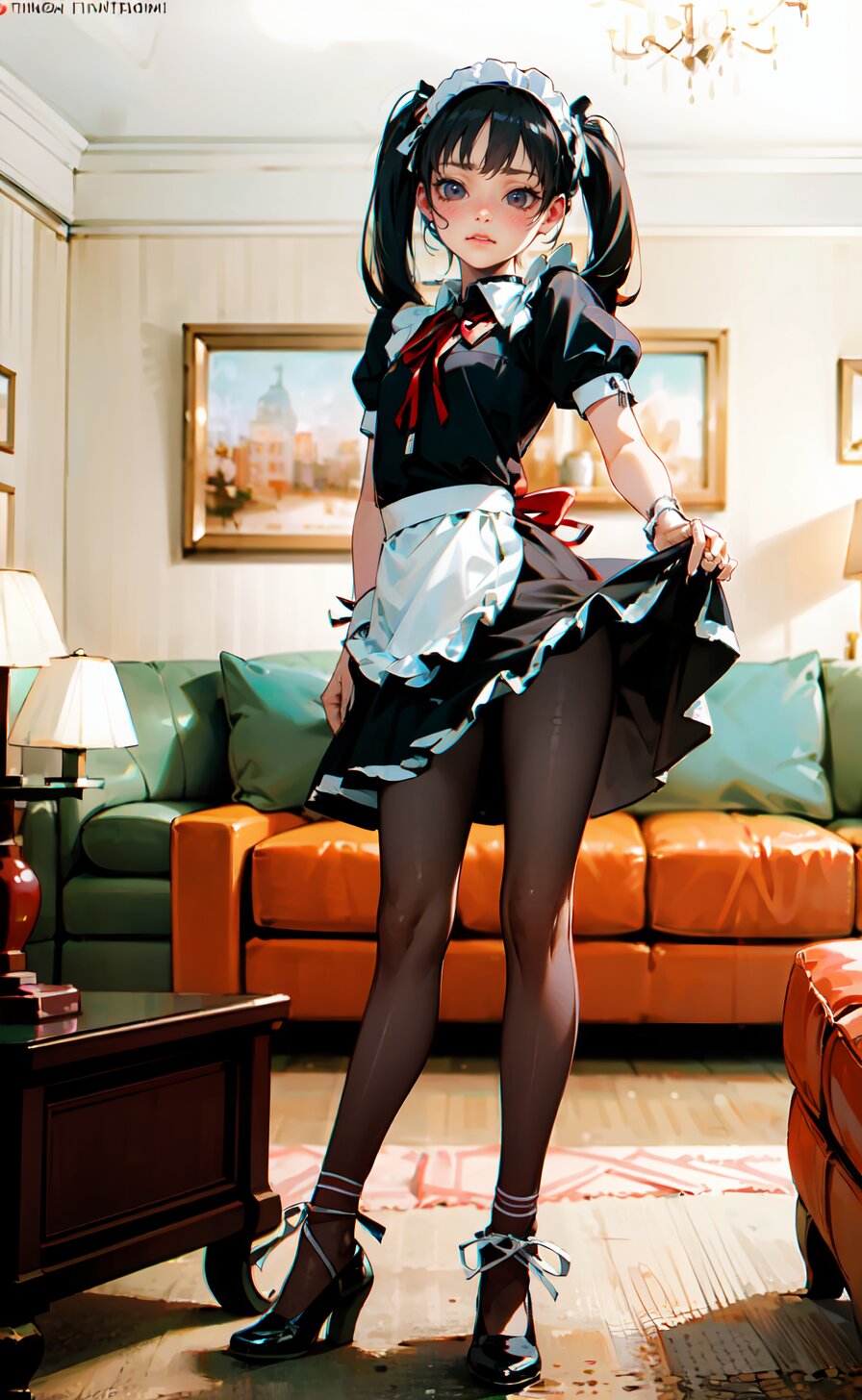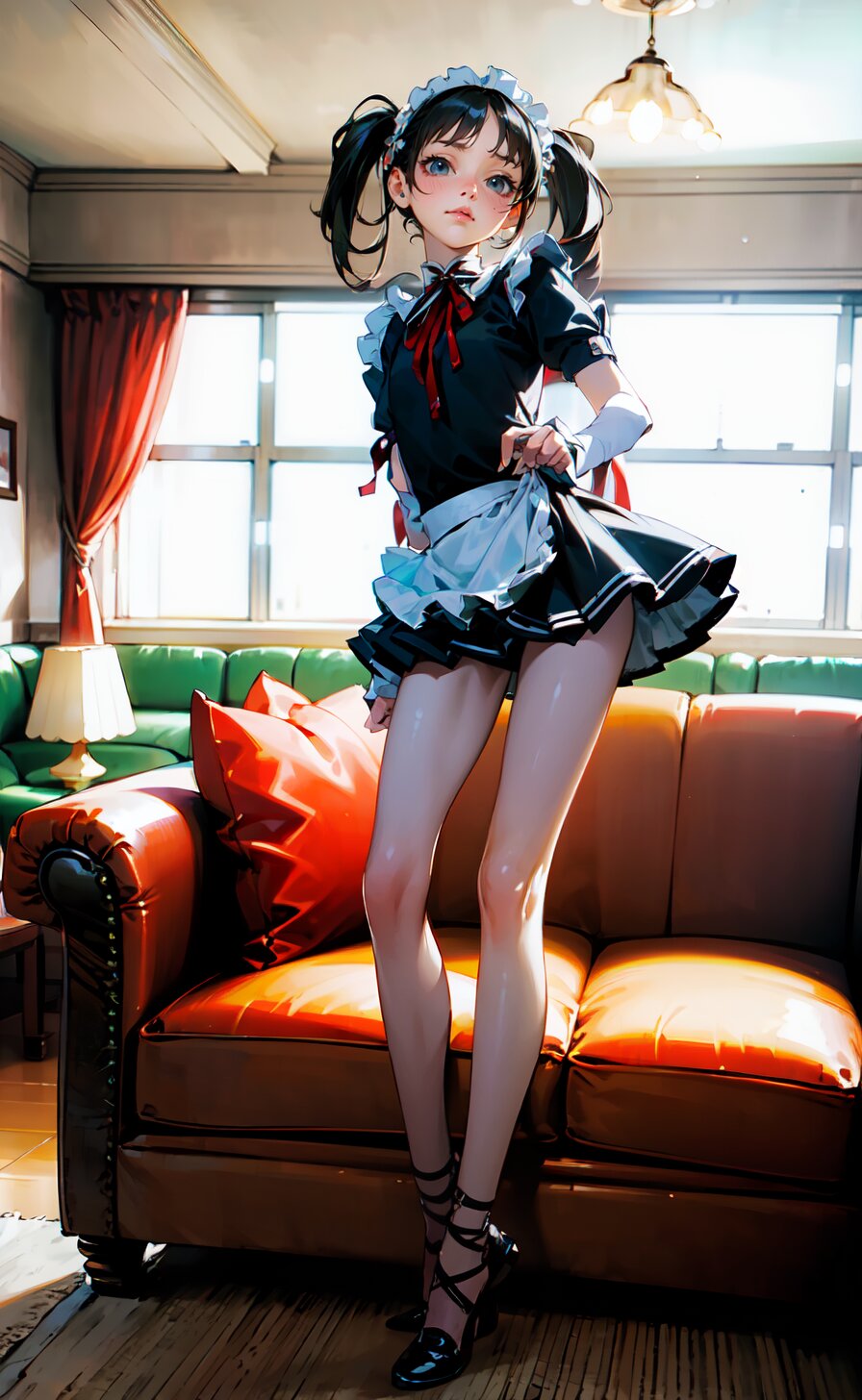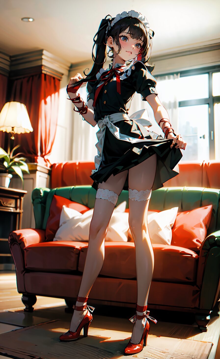 (8k, best quality, masterpiece:1), (realistic, photo-realistic:1.4), (sexy posing, from front: 1.6), 1girl, 12 years, french maid, looking away, (full body:1.8), (((complete flat chest))), beautiful detailed face, perfect skin, detailed skin texture, (twintails with ribbon, red French Elegant Sissy Mini Maid Dresses: 1.6), (an extremely delicate and beautiful hands), (in the bright livingroom: 1.6), <lora:yuduki_v01:0.6>