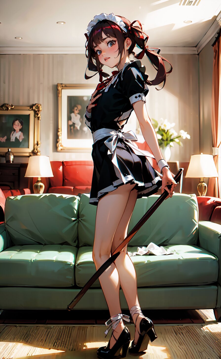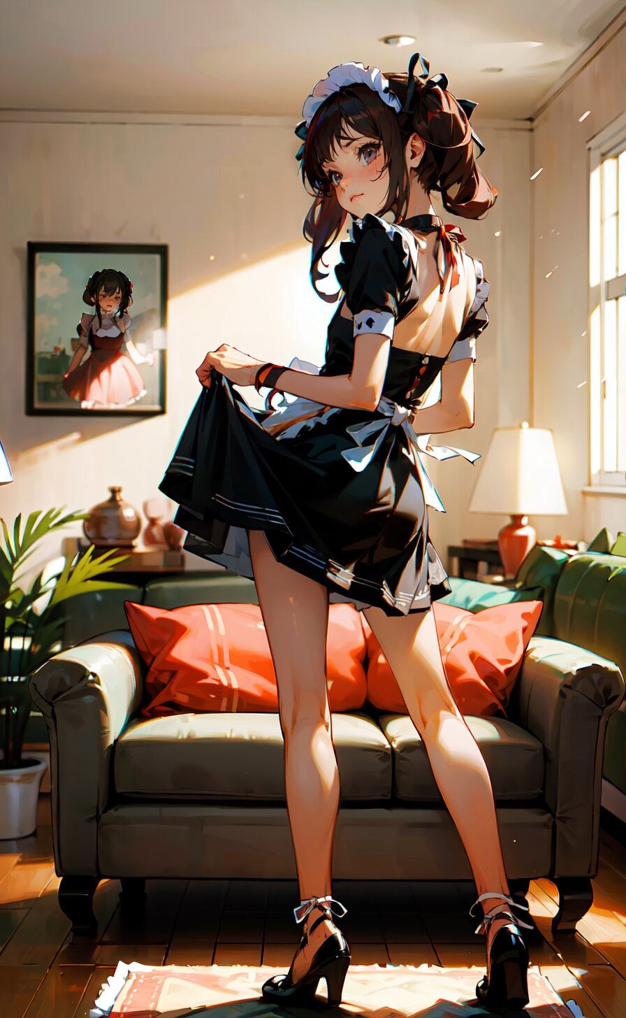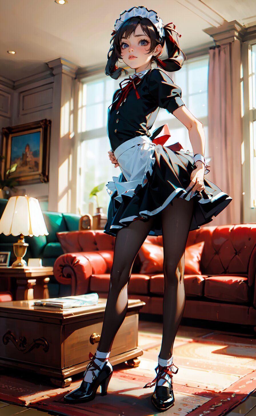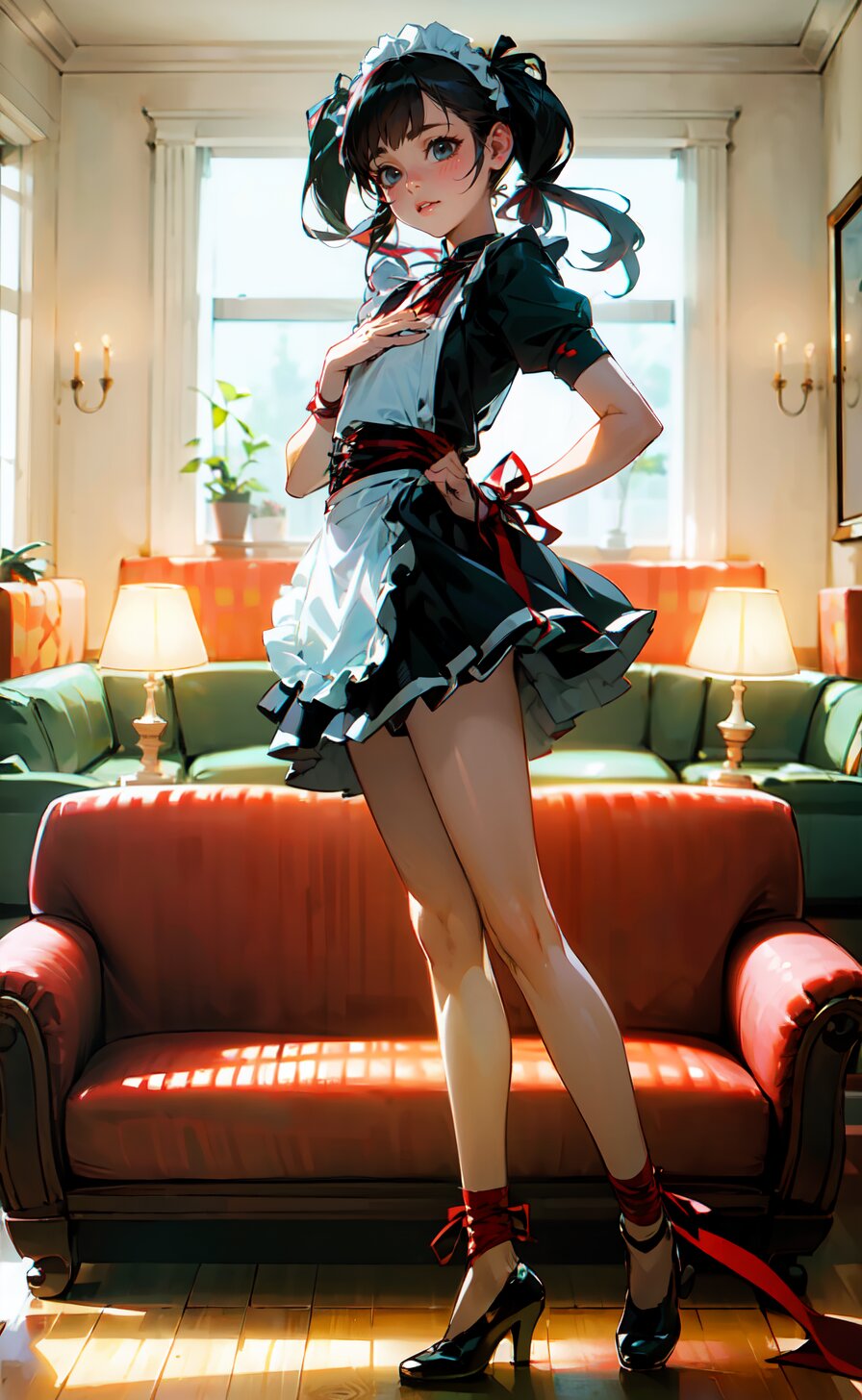 (8k, best quality, masterpiece:1), (realistic, photo-realistic:1.4), (sexy posing, from front: 1.6), 1girl, 12 years, french maid, looking away, (full body:1.8), (((complete flat chest))), beautiful detailed face, perfect skin, detailed skin texture, (twintails with ribbon, red French Elegant Sissy Mini Maid Dresses: 1.6), (an extremely delicate and beautiful hands), (in the bright livingroom: 1.6), <lora:yuduki_v01:0.6>