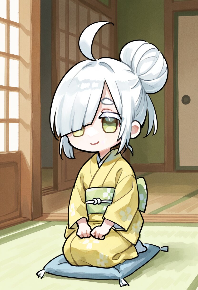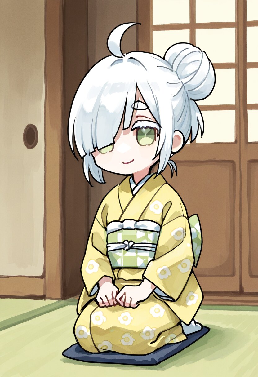 <lora:inmnstyleilxl:0.9>, best quality, masterpiece, very aesthetic, watercolor painting, general, 1girl, chibi, solo, (bright white hair), short hair, blunt bangs, single bun, white thick eyebrow, white colored eyelashes, (hair over one eye), ahoge, mintgreen eyes, yellow kimono, Japanese room, seiza, smile