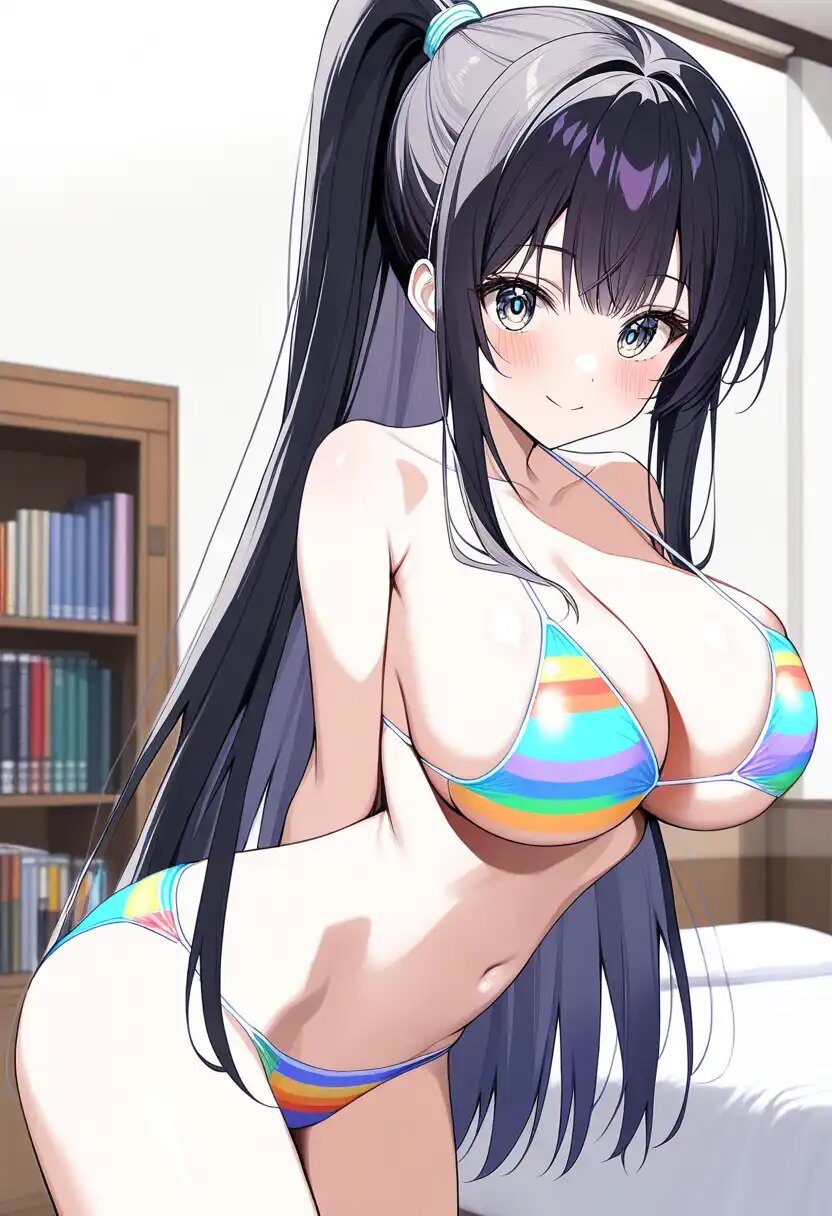 [rainbow bikini]++, [huge breasts]++, perky breasts, hanging breasts, curvy, cleavage, collarbone, bare shoulders, bare arms, stomach, bare legs, cowboy shot, BREAK tall, [long hair]++, [straight hair]++, [shiny]++, [shiny skin]++, [big eyes]++, [shining eyes]++, BREAK legs together, [arms behind back]++, smile, blush, closed mouth, bedroom, standing, light, day, indoors, curtains, bookshelf, [high ponytail]++, [ponytail holder]++,
