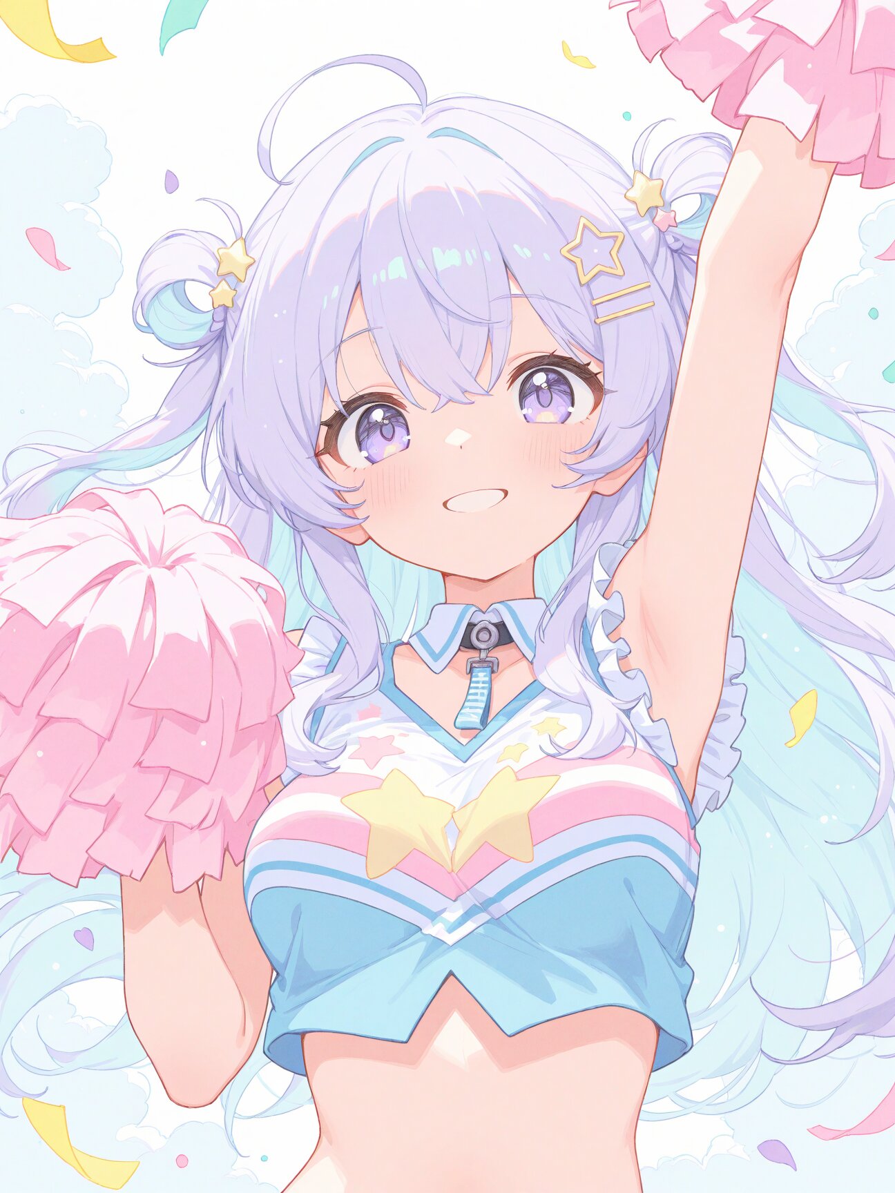cheerful anime girl in pastel cheerleader outfit, waving pom-poms, bright smile, energetic pose, soft daylight, colorful confetti, lively and cute mood, soft glow, sparkles, floating petals, fluffy textures, star motifs, heart motifs, translucent fabric, soft frills, magical atmosphere, gentle light, dreamy background, faint clouds, cute accessories, subtle rainbow tones, (masterpiece:1.3), (best quality:1.2), dreamy pastel bokeh, soft rim light, crisp anime lineart, soft cell shading, high detail, elegant atmosphere, Pastel color palette, (Upper body: 0.9), soft cute girl with soft lavender hair and light blue inner highlights, long hair with two side buns and loose curls, one stray hair, large, bright purple eyes, a gentle smile, a faint glow, anime-style with emphasized contours, flat pastel-toned shading.single ahoge, medium breasts,star-shaped hairpin,, (soft pastel color palette:1.5), (pale colors:1.3), watercolor texture, matte finish, subtle shading, minimal contrast,