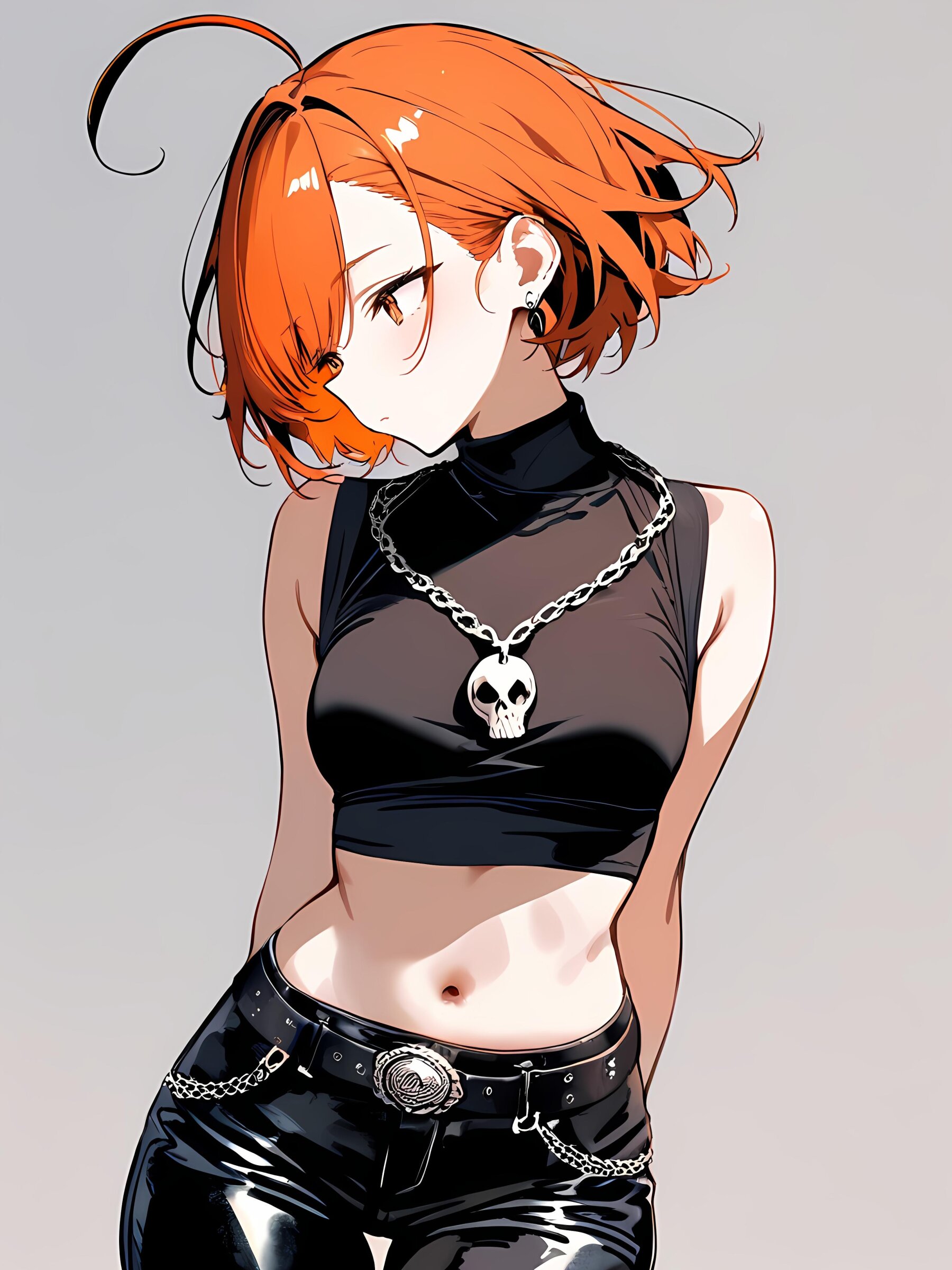 solo, woman, short hair, Black no sleeve High neck shirt, belt, orange hair, asymmetry bangs, ahoge, leather hot pants, skull necklace, simple background,