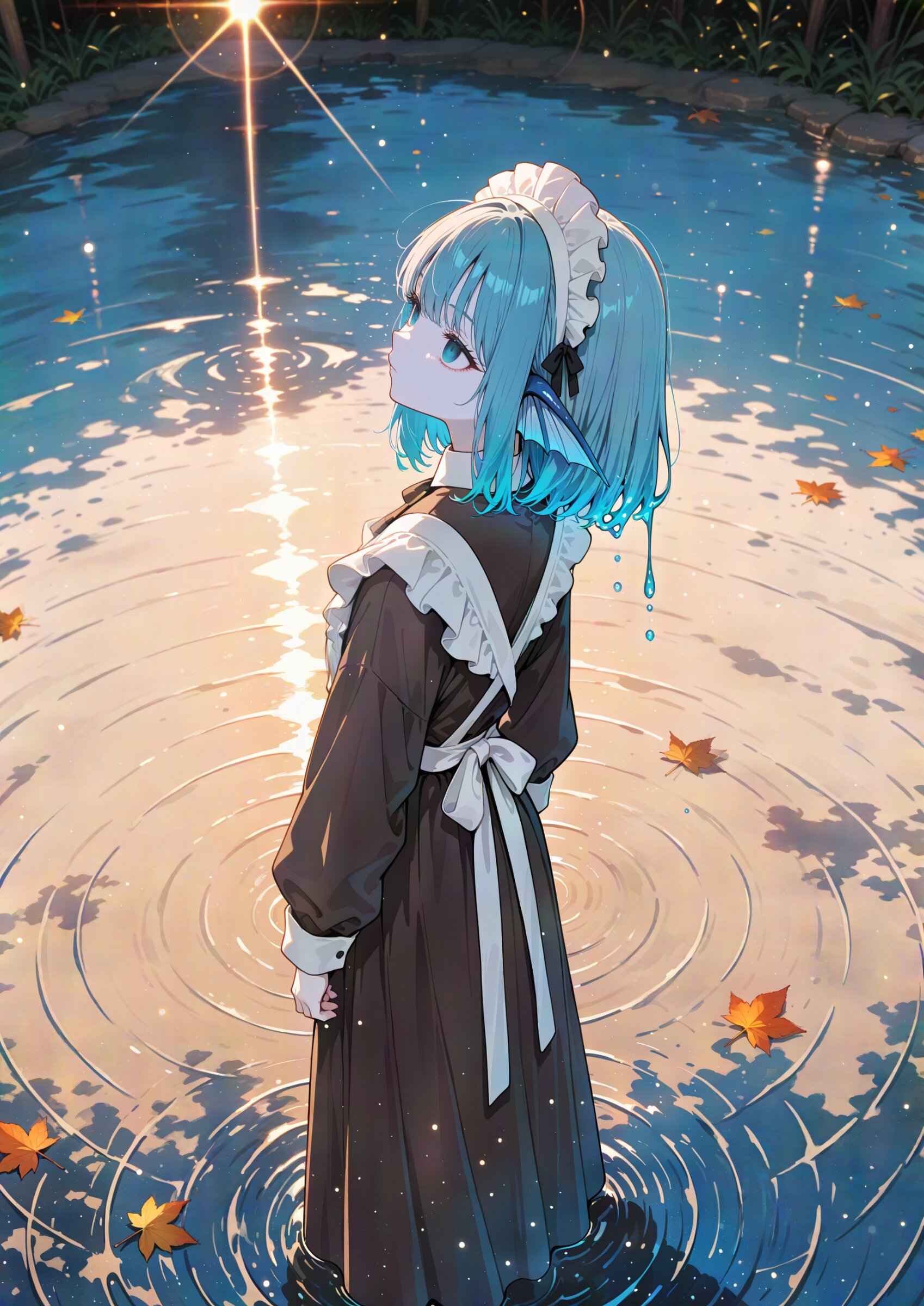 from side, overlooking, looking afar (from above,looking up:1.0) looking ahead, (dutch angle:1.2) autumn atmosphere, earthy color, 1girl, (ultra-detailed), solo, maid, pale skin, pale steelblue hair, (beautiful empty eyes, expressionless, shaded face:1.0), long sleeves classic maid uniform, long skirt, maid headdress, maid apron, luminous effect lens flare shiny-glistening cute girl solo pinhole lens, from behind, looking another, (aerial view:1.0), (liquid hair, floating clear water, head fins, ripples, wadeing:1.1), super fine concept art, hard surface, graceful eyes, masterpiece, best quality, amazing quality, very aesthetic, absurdres, newest, professional art lots of details, , overexposure, sumi-e effect style, 4ur4_illu,shiny, glowing, glowing particles, glowing light particles, light particles, shadow, <lora:noline (1):-0.5> <lora:sdxl2-flat2-512b:0.0> <lora:facelightup_xl_v10:0.5>