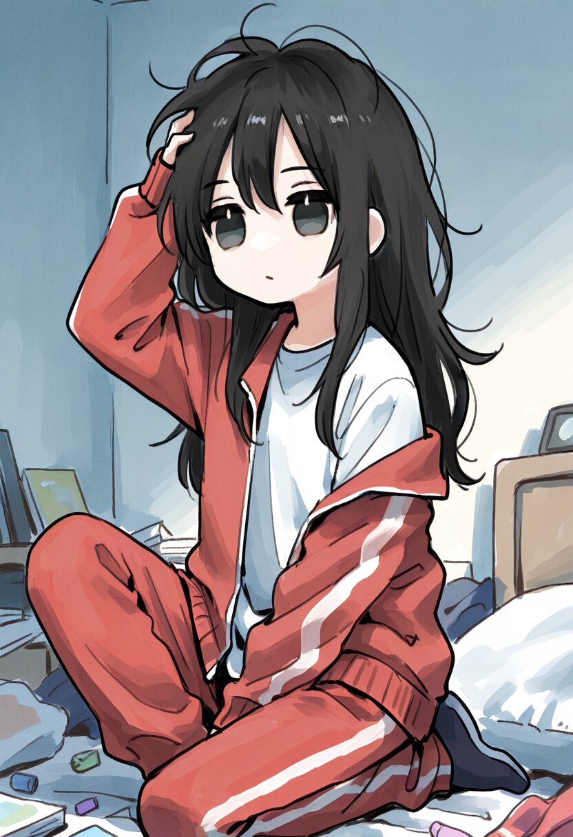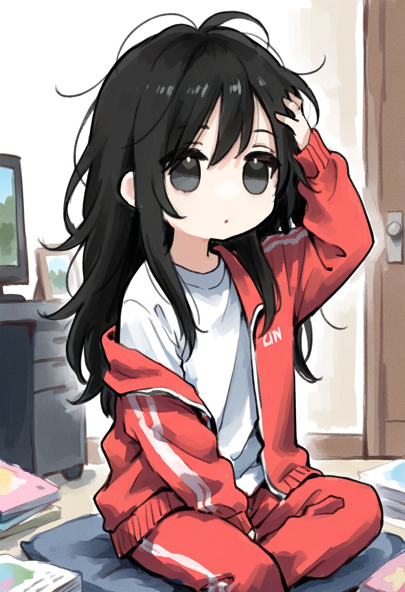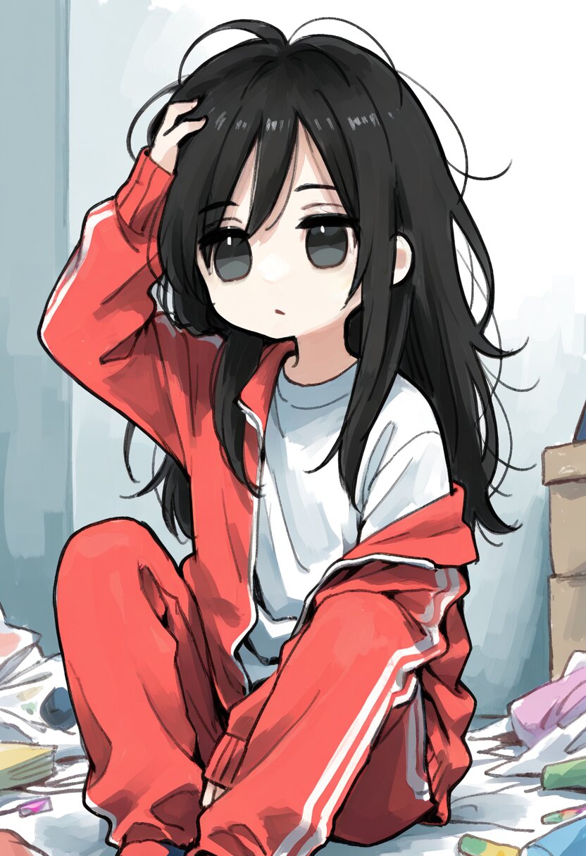 <lora:inmnstyleilxl:0.9>, best quality, masterpiece, very aesthetic, watercolor painting, general, 1girl, chibi, solo, black hair, long hair, messy hair, black eyes, off shoulder red tracksuit, sleeves past wrists, white t-shirt, sitting, hand on own head, messy room