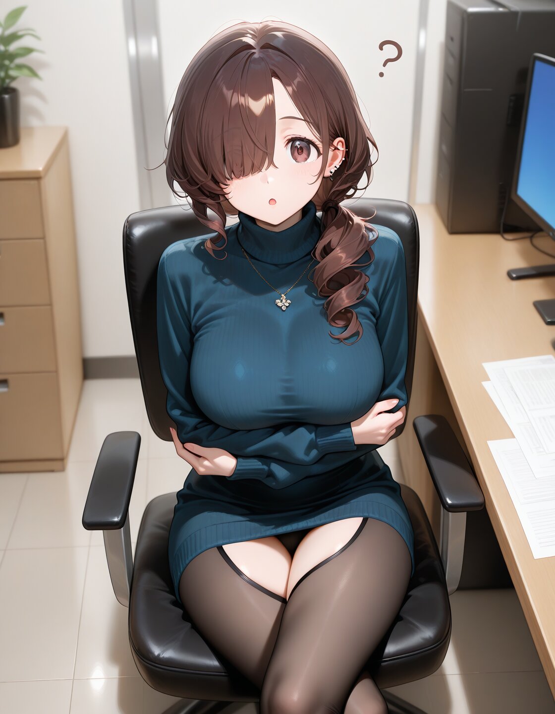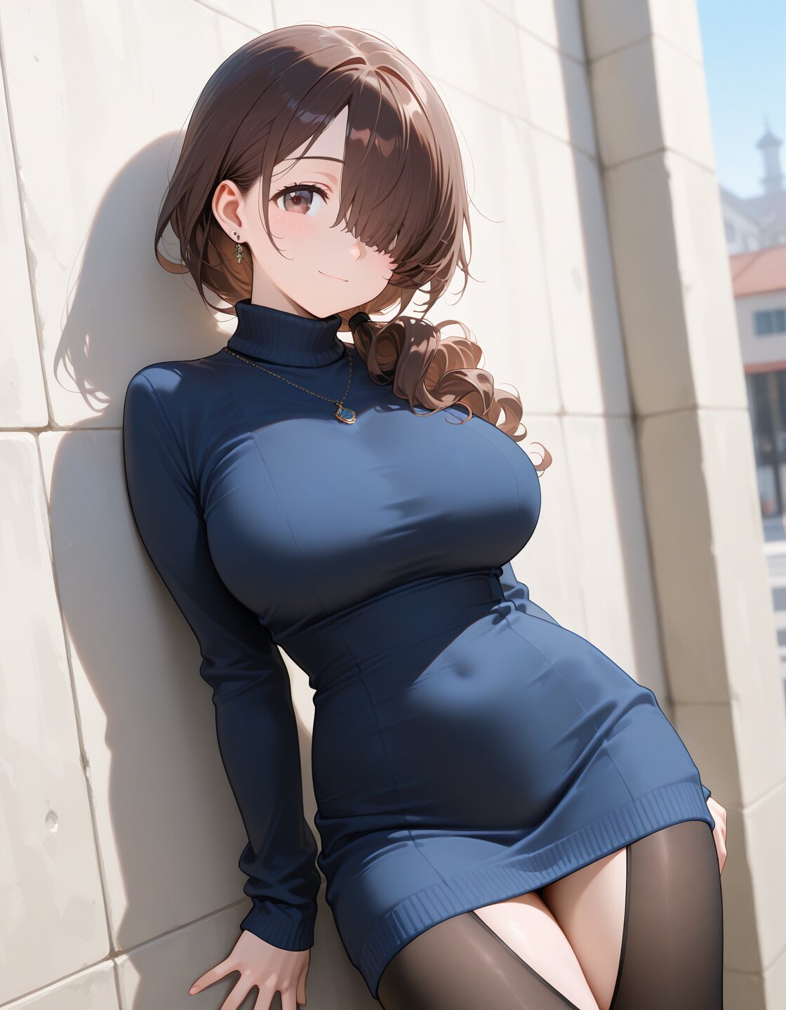 1girl, sensitive, (beautiful eyes, detailed eyes), looking at viewer, three quarter view, dutch angle, solo, cute, outdoors, cowboy shot, (hair over one eye, tareme:1.4), dark brown eyes, dark brown hair, long hair, (curly hair), low ponytail, hair over shoulder, large breast, navy sweater dress, black pantyhose, thigh cutout, thigh, turtleneck sweater, long sleeves, necklace, ear piercing, leaning back, against wall, light smile, standing, masterpiece, best quality, amazing quality,