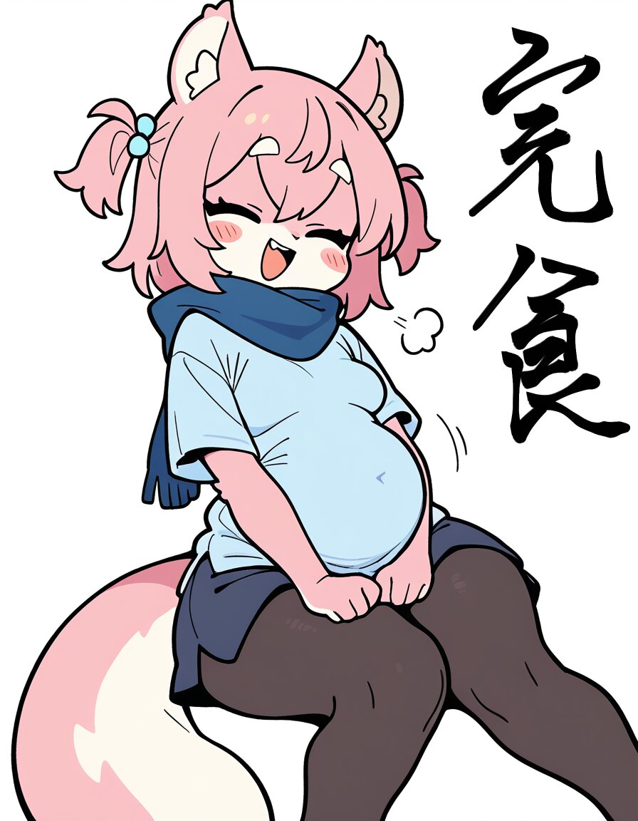 1girl, solo, short female, loli, (squirrel girl), (furry female), pink squirrel ears, pink squirrel tail, (flat breasts), slim, wide hips, thick thighs, pink hair, short hair, two side up, pink eyebrows, hair between eyes, tsurime, closed eyes, blush stickers, open mouth, smile, blue scarf, blue sleeved T-shirt, half-sleeve T-shirt, blue culottes, black pantyhose under culottes, stuffing, bloated belly, puff of air, white background, sitting on invisible floor, knees up, invisible floor, from front, three quarter view, smooth, (high contrast), (stylized), (kawaii), (cute), ((detailed_anatomy)), gddw, (detailed_hands:1.5), flat color style, simple coloring style, black pantyhose, furry, (two tone fur), (furry body), perfect body, detailed face, visible wide hips, high quality, cute clothes, animal tail, animal ears, solo, big ass, voluminous thighs, masterpiece