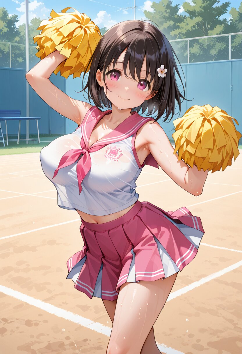 masterpiece, best quality, amazing quality, general, fine detail, official art, 1girl, loli, petite, beautiful hair, beautiful eyes, cheerleader, pink sailor collar, sleeveless, cleavage between sailor collar, midriff peek, beautiful legs, (big breasts:1.2), impossible clothes, (perky breasts:1.2), school yard, sweaty, innocent expression, smile, Practicing dance, dynamic action, Flexible chest that adapts to her movements,