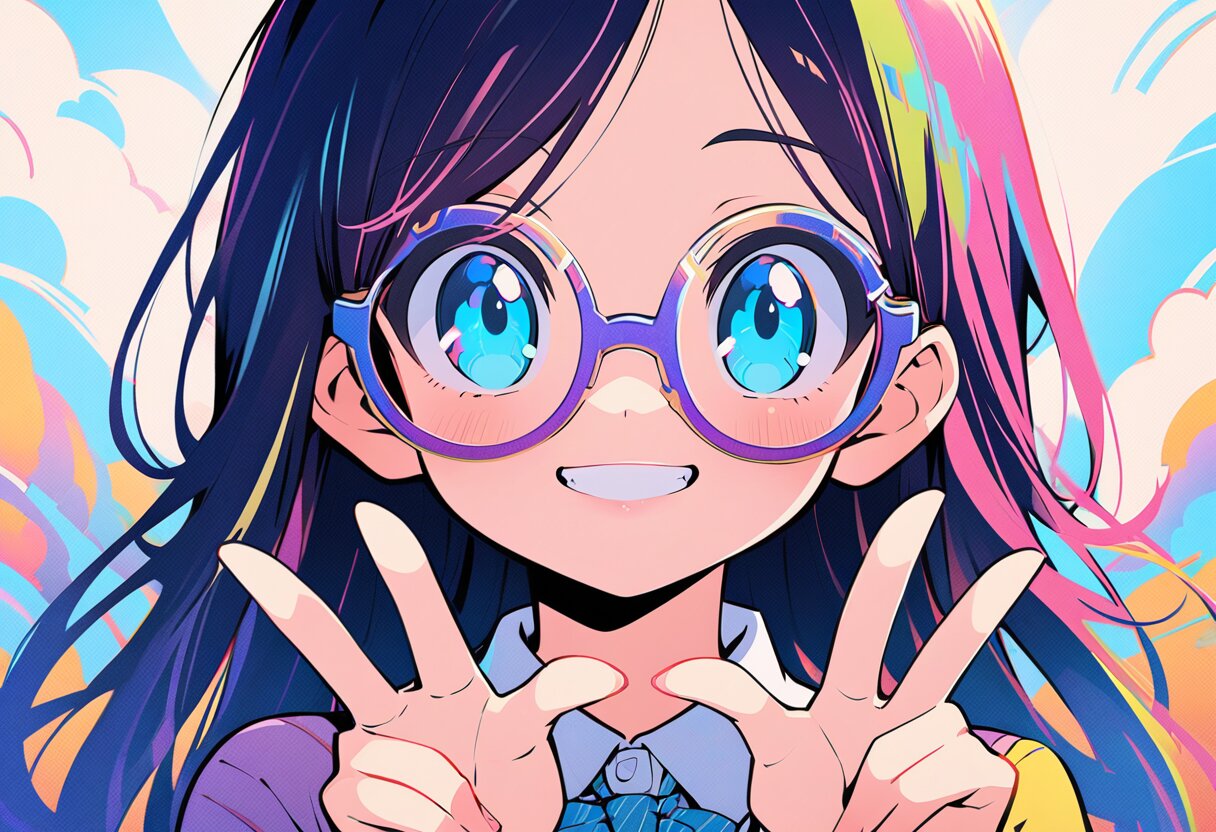 masterpiece, best quality, beautiful detailed eyes, ultra-detailed, finely detail, highres, perfect anatomy, colorful, Kyoto Animation, (1 cute girl), solo, simple background, retro style, (1990s city pop art style), (city pop anime), retoro anime, RETRO ART STYLE, NEON_POP ART STYLE, sky, glasses, (school uniforms), (double teeth), cute smile, cute illustration, fuwafuwa illustration, high school girl, pastel colors, upper body, (peace sign), detailed and intricate, (inkpunk, inkpunk style), ,