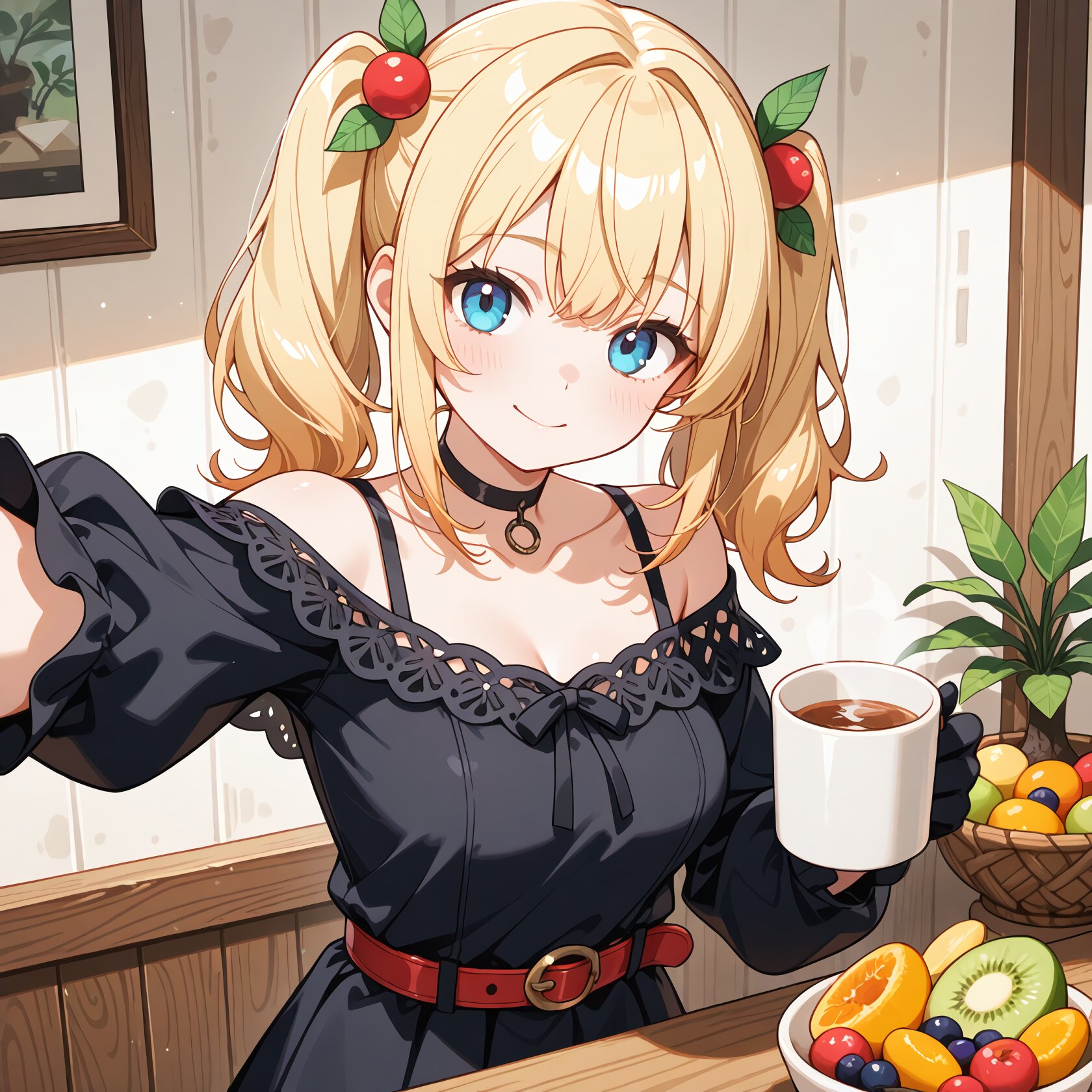 (masterpiece, best quality, ultra-detailed, intricate details, anime style, 8k illustration), 1girl, blonde medium hair, twin tails, blue eyes, medium breasts, black dress, bare shoulders, off shoulder, belt, puffy sleeves, black gloves, choker, A cozy holiday morning in a sunlit kitchen. A woman is taking a selfie. On the table in front of her is a colorful fruit bowl filled with kiwi, mango, blueberries, and raspberries, along with a steaming mug. She smiles softly, looking relaxed. The background features warm wooden tones and a small plant. Bright, fresh, pop aesthetic. The focus is on the selfie-style framing of the woman and the vivid fruits.
