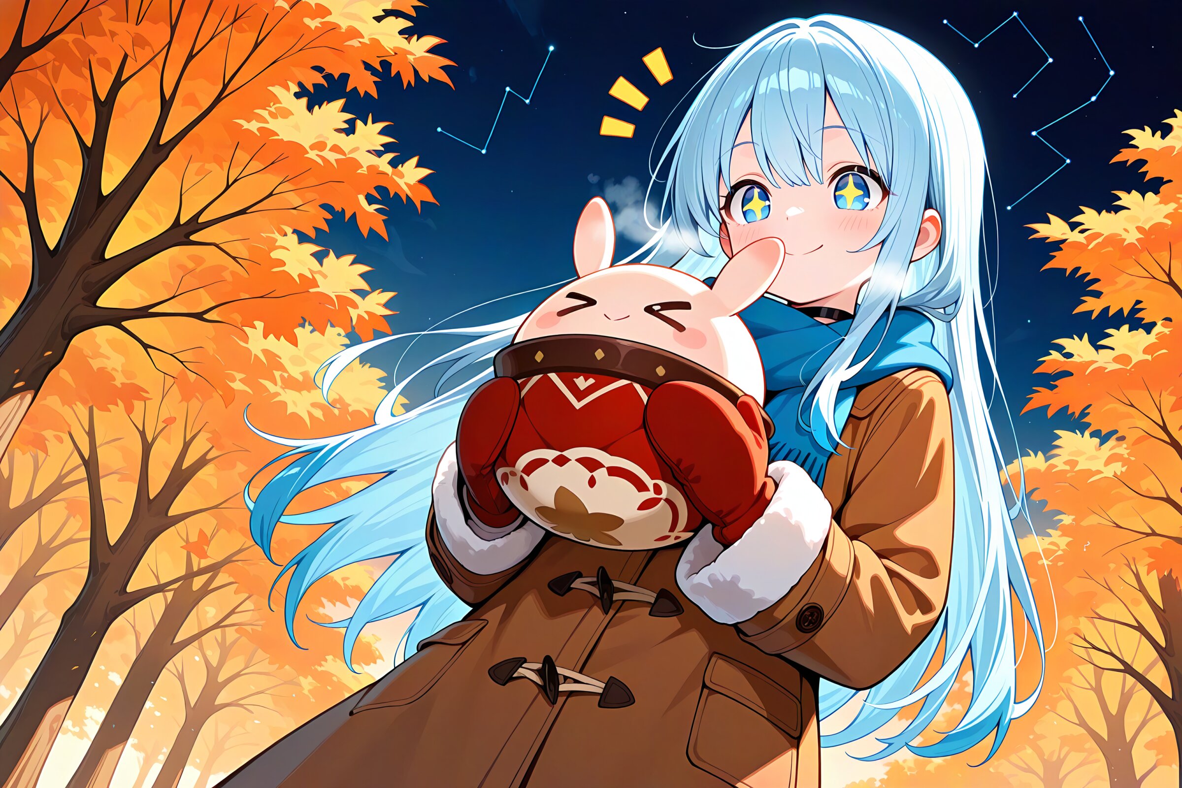 1 little girl, solo, diagonal angle, from below, masterpiece, best quality, amazing quality, very aesthetic, sky blue hair, long hair, straight hair, blue eyes, +_+, closed mouth, smile, cheerful, +++, notice lines, choker, autumn outfit, long coat, scarf, mittens, white breath, holding humpty dumpty, > <, constellation, night, clear sky, autumn,