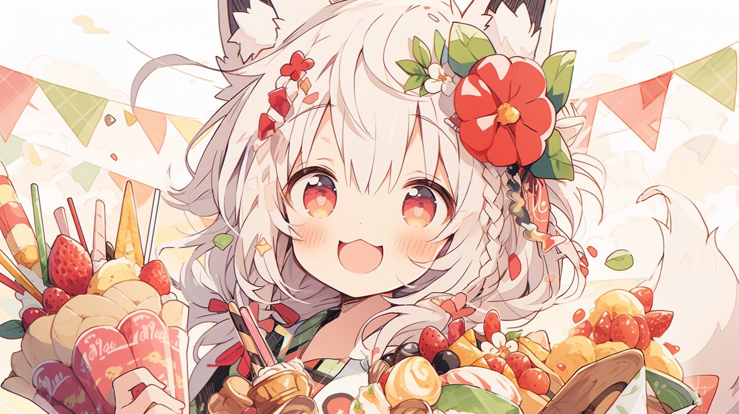 果実の森に住む小さな狐娘は、今日もお祭りの準備に大忙し。頭に赤い花を飾り、バスケットいっぱいの新鮮なイチゴやフルーツを抱えて、みんなを笑顔に導く。風に揺れる旗の下で、甘い香りが広がる中、彼女の冒険は始まる。どんな楽しい出会いが待っているのか、森の秘密を探検する彼女の日常は、誰もが憧れる夢のような瞬間だ。