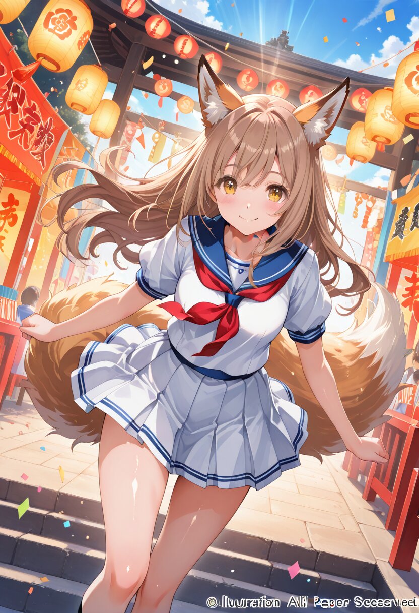 (high resolusion,illustration,ultra detailed 8k art,extremely detailed CG,official art,clothes reflecting light,detailed shiny skin,detailed background:1.3), ((highly detailed beautiful face and eyes),anime style, fox ears girl, light brown hair, long hair, double eyelids, long eyelashes, fluffy tail, dynamic angle, dynamic pose, sailor school uniform, school festival setting, colorful decorations, cheerful expression, playful mood, wind-blown hair, festive atmosphere, outdoor stage, paper lanterns, confetti, soft sunlight, fantasy realism, cinematic composition, ultra-detailed, masterpiece