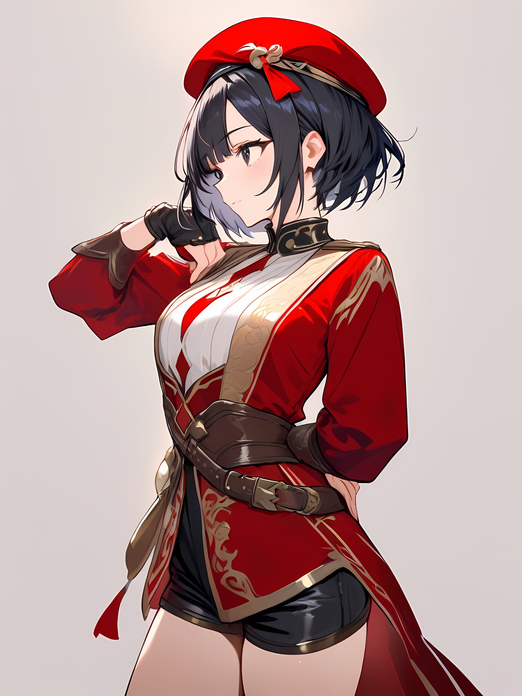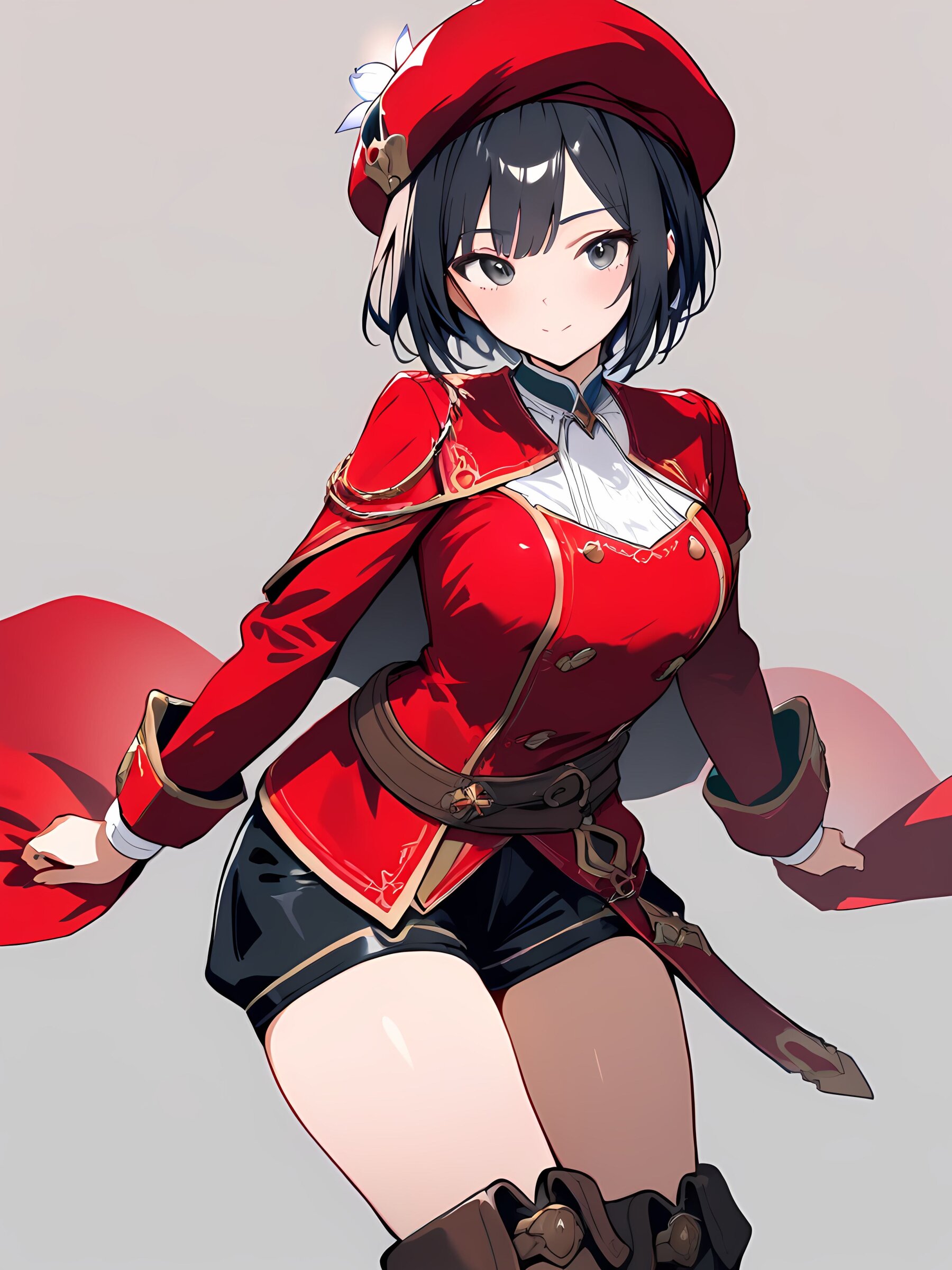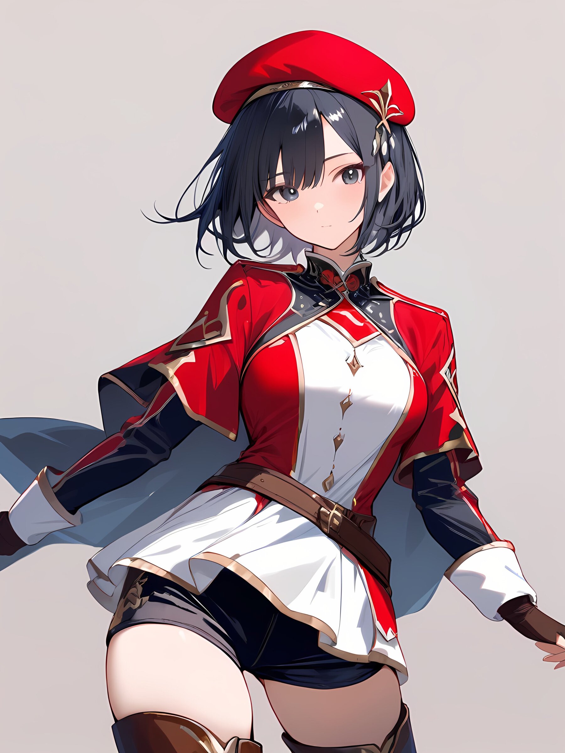 solo, girl, Black eyes, Black hair, red Clothes that are easy to move in, béret hat, short hair, red prince costume Gold-trimmed clothing, cowboy shot, Black short pants, brown leather boots, simple background,