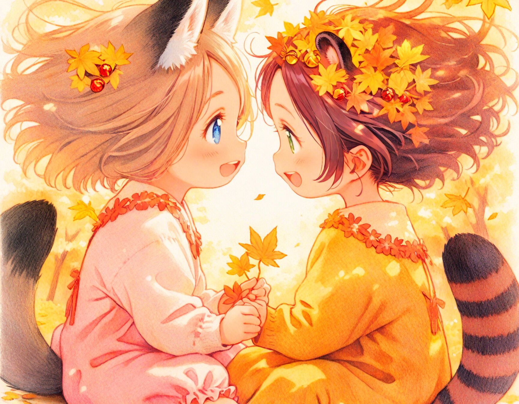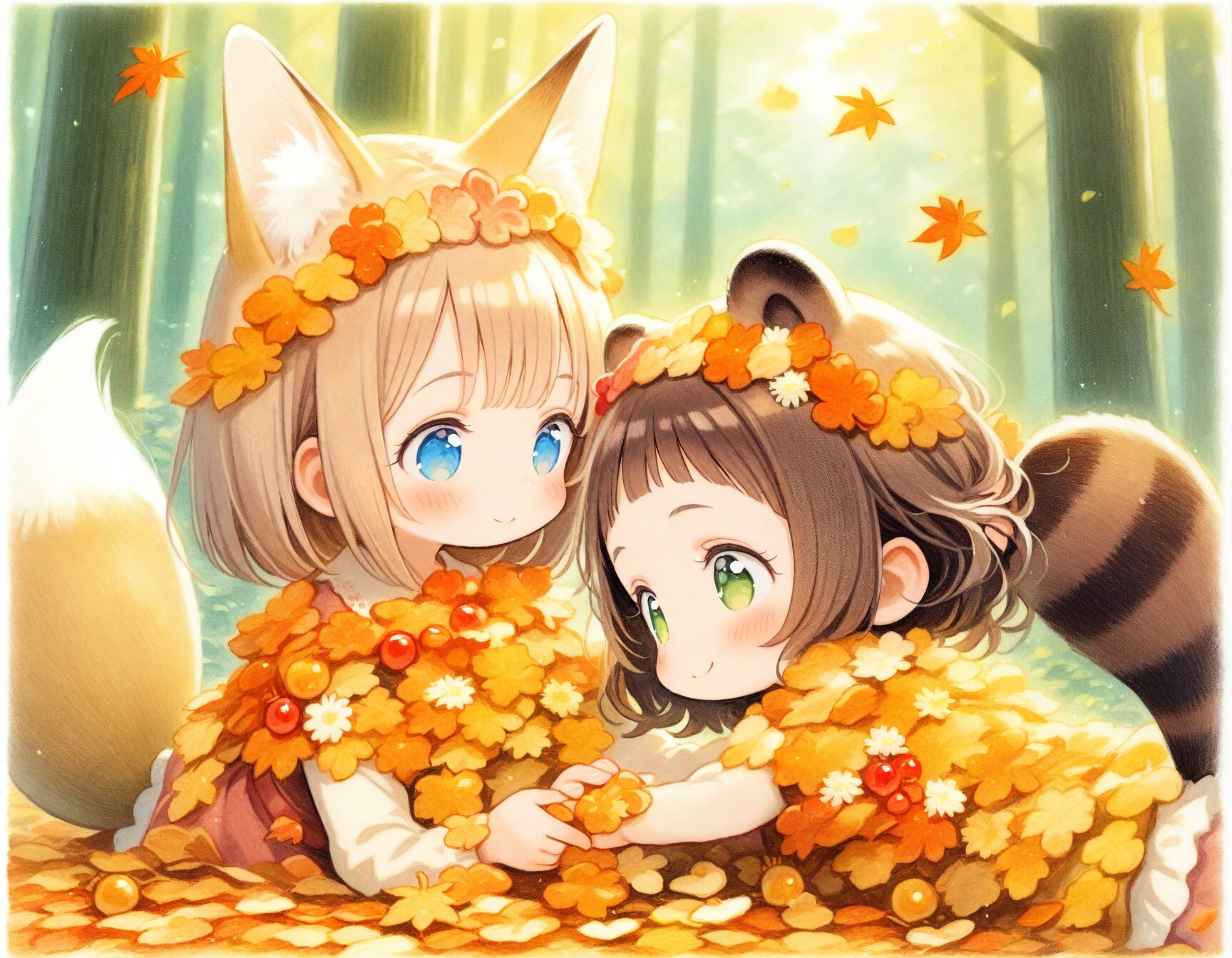 2girls, loli, mid, general, traditional media, picturebook-style, (colored pencil drawing), pastel colors, soft tone, no lineart, no outline, (drawing lines, Paper texture), cute, deformed, ultra-detailed background, Very detailed and textured costumes, (barasui:0.1), (oyari ashito:0.1), (masterpiece, best quality), dynamic angle, dynamic composition, dynamic pose, from side , , (upper body:1.4), convenient skirt, hand in another's hair, hair ornament, holding hair ornament, looking looking at another, decorating each other's hair with handmade ornaments in autumn mountain forest, sitting face to face on moss-covered ground, gentle smiles, joyful expressions, soft warm lighting, golden hour atmosphere vivid red and orange maple leaves Hair ornaments, small wildflowers (gentian blue, aster purple) Hair ornaments, colorful berries (red winterberry, orange rosehips) Hair ornaments, acorns with caps Hair ornaments, small pinecones Hair ornaments, shallow depth of field, beautiful bokeh effect, magnificent autumn foliage (maple trees with gradient red-orange-yellow leaves), mountain path visible in distance, scattered fallen leaves on ground, golden sunlight filtering through tree canopy, soft dappled light, warm color palette peaceful, heartwarming, nostalgic autumn scene, gentle breeze suggested by few floating leaves, intimate friendship moment BREAK loli, light brown hair, medium hair, choppy bangs, blue eyes, (light brown fox ears, Light brown fox tail with white tip, petite), smile, happy, pink pinafore dress, frilled bloomers, BREAK loli, dark brown hair, short hair, messy hair, short bangs, green eyes, tareme, (dark brown raccoon ears, dark brown raccoon tail with striped pattern), happy laughing, green pinafore dress, frilled bloomers,