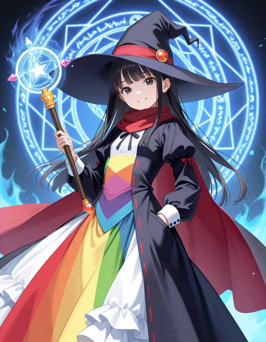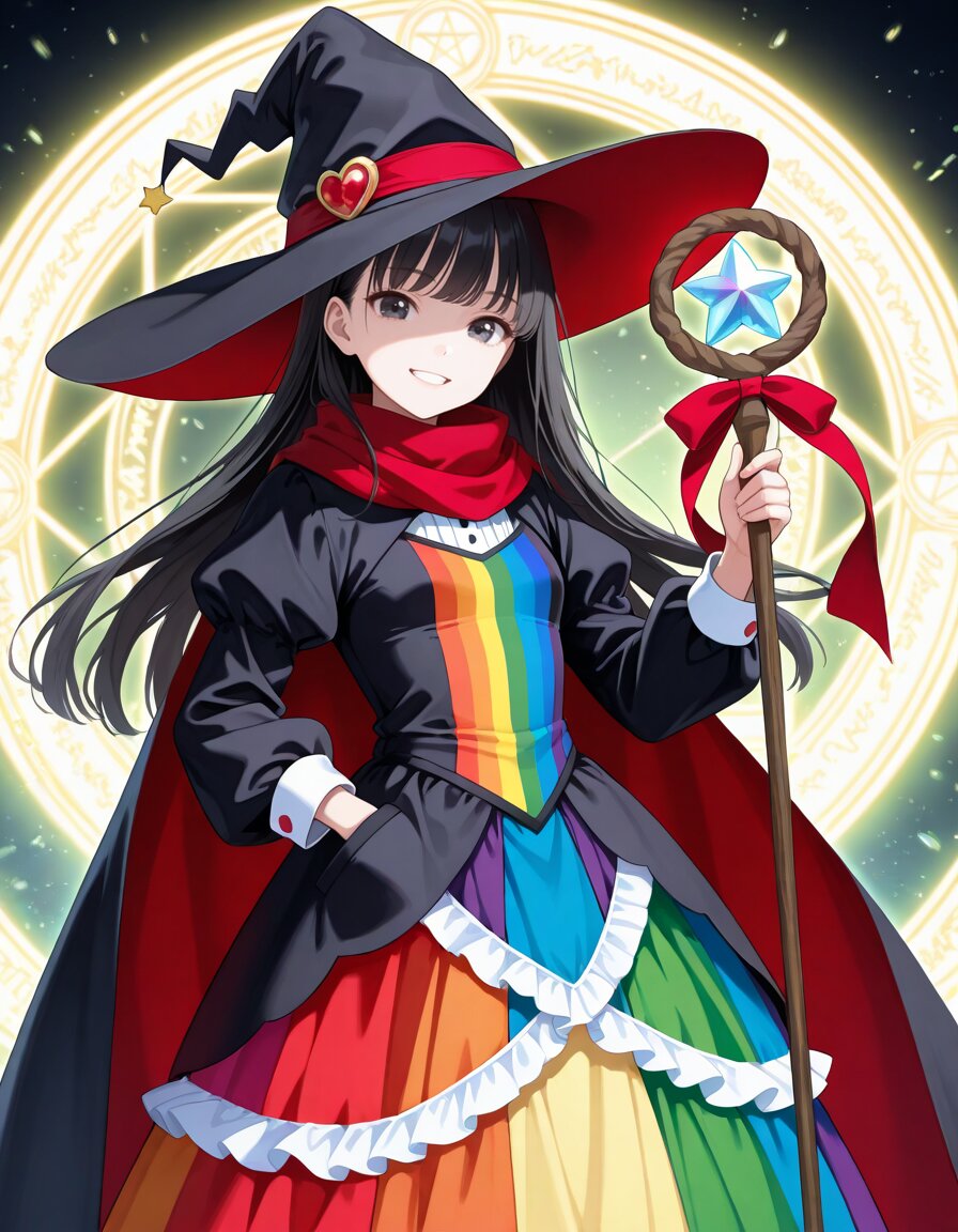 masterpiece,best quality,highres,highly detailed,general,1girl,solo,17yo,(hand in pocket,holding magical stick, black witch hat,long red scarf,grin),cute girl,slender,small breasts,long sleeves,light smile,black hair,long hair,bangs,black eyes,magical girl,(magical girl outfit,rainbow clothes,long rainbow dress,frilly dress,puffy sleeves,magical cape,ribbon trim,very long dress skirt),slender girl,aura,huge magic circle,huge magic circle background,cowboy shot,fantasy,