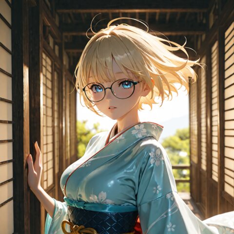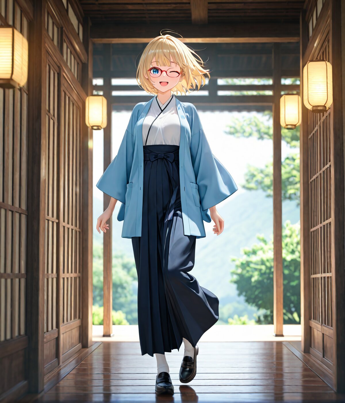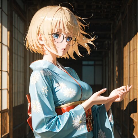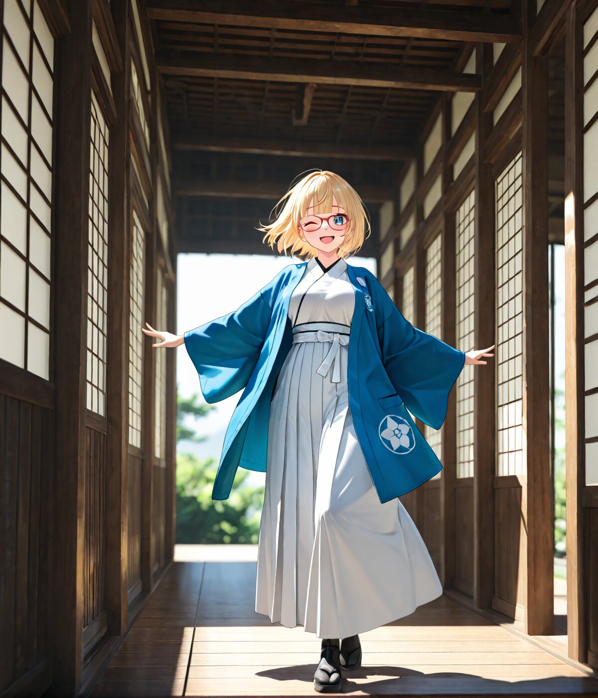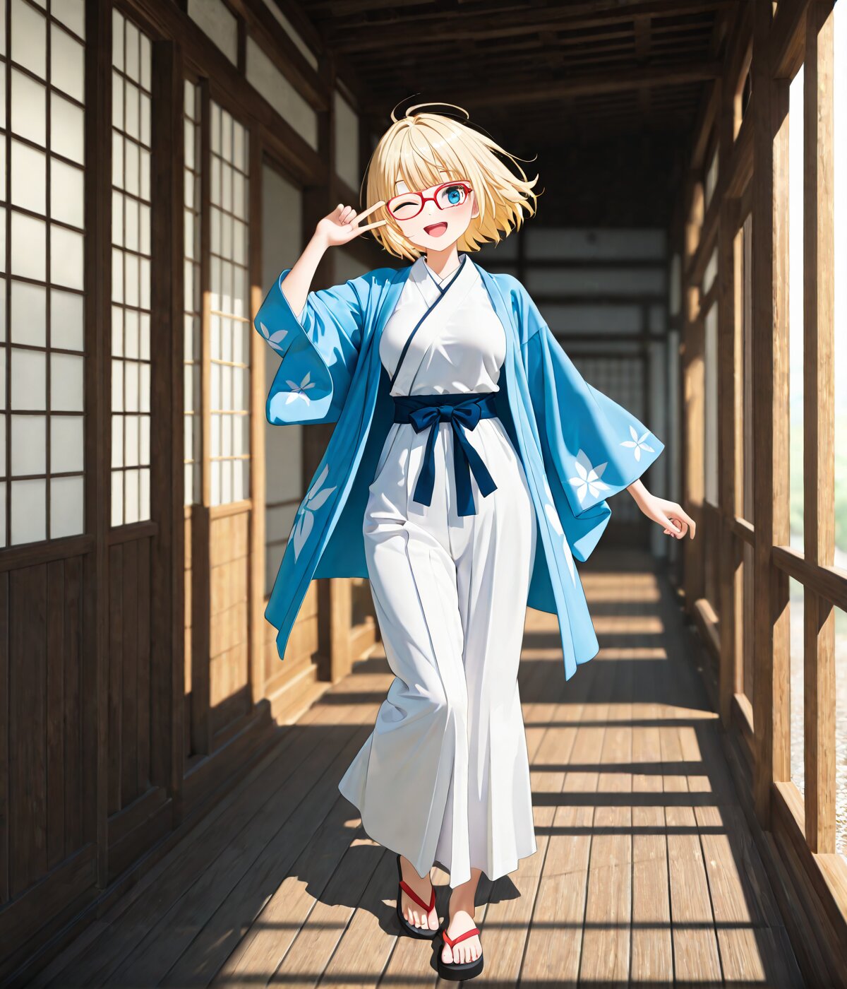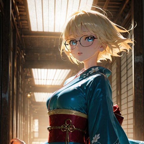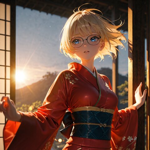 masterpiece, best quality, amazing quality, 4k, very aesthetic, high resolution, ultra-detailed, absurdres, newest, scenery, 3d, rendered, backlit, red glasses, blonde hair, short hair, choppy bangs, ;D, blue eyes, white blue, 1girl, haori, medium breasts, full body, portrait, fish eye, dynamic, modern urban renewal area, floating hair, BREAK, hands, fingers, vignetting, dramatic shadow, cinematic lighting, rim light, detailed background, depth of field, vignetting, volumetric lighting