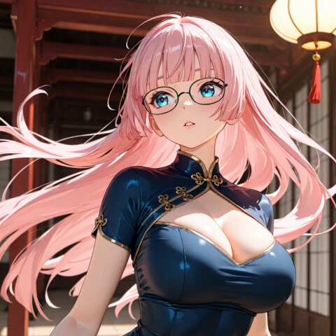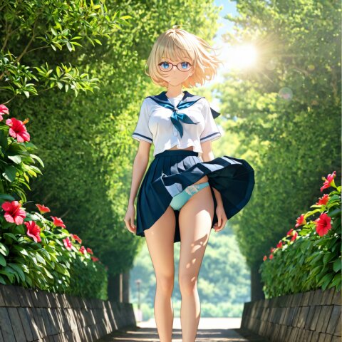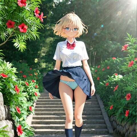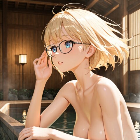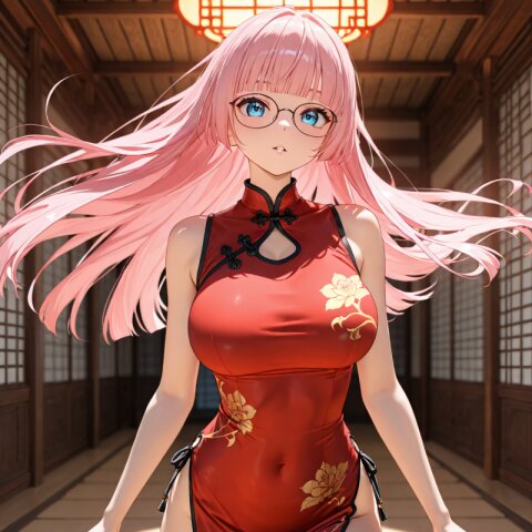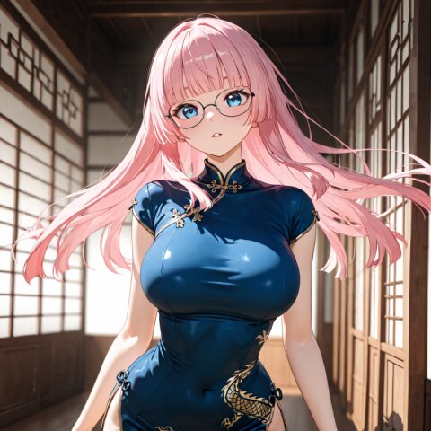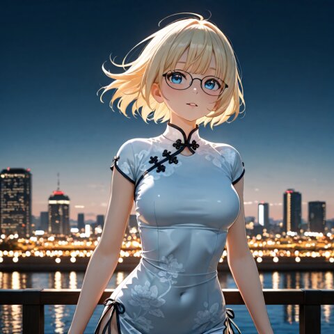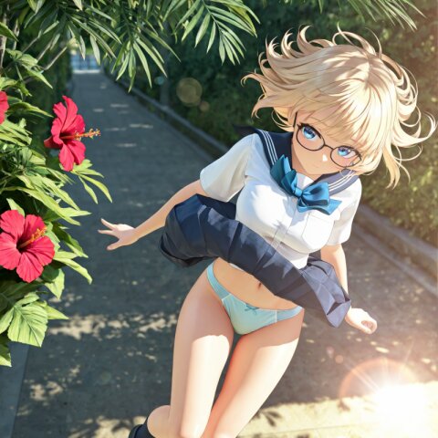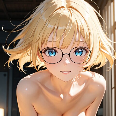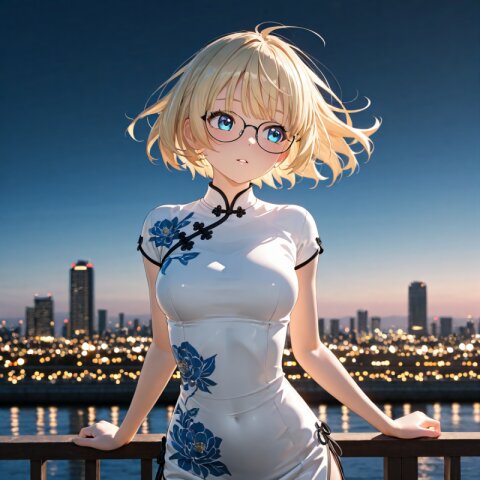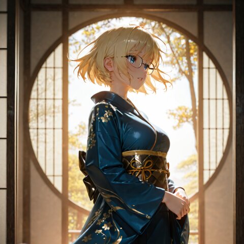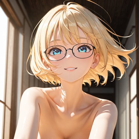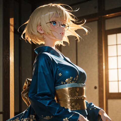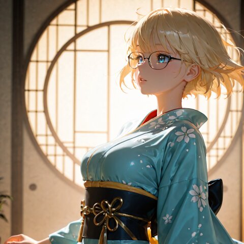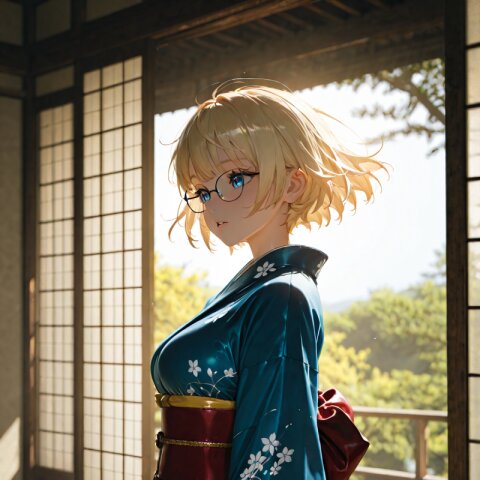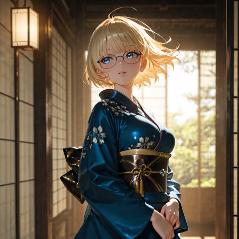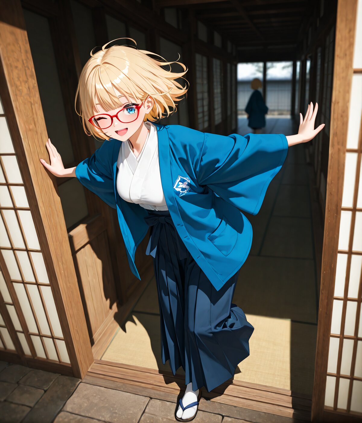 masterpiece, best quality, amazing quality, 4k, very aesthetic, high resolution, ultra-detailed, absurdres, newest, scenery, 3d, rendered, backlit, red glasses, blonde hair, short hair, choppy bangs, ;D, blue eyes, white blue, 1girl, haori, medium breasts, full body, portrait, fish eye, dynamic, modern urban renewal area, floating hair, BREAK, hands, fingers, vignetting, dramatic shadow, cinematic lighting, rim light, detailed background, depth of field, vignetting, volumetric lighting