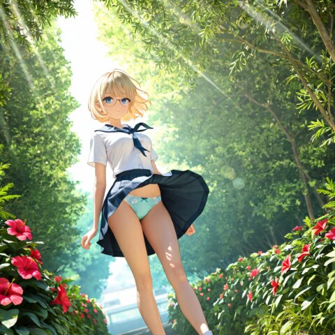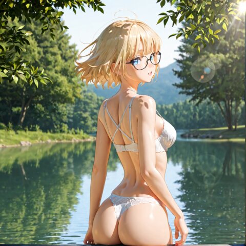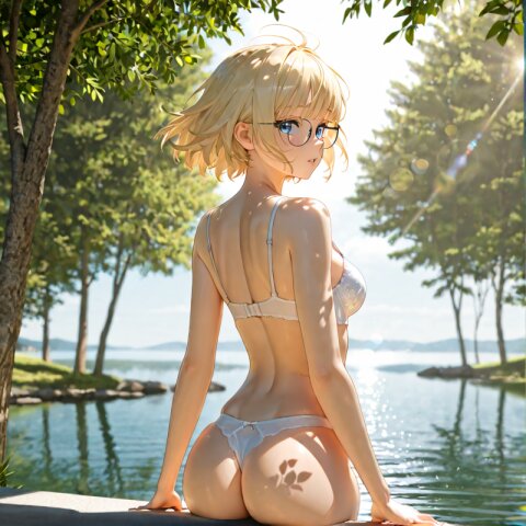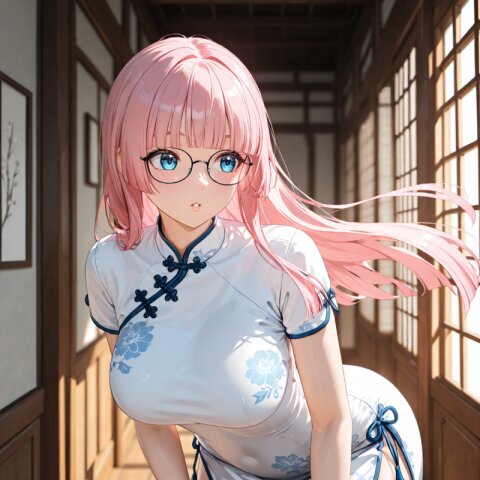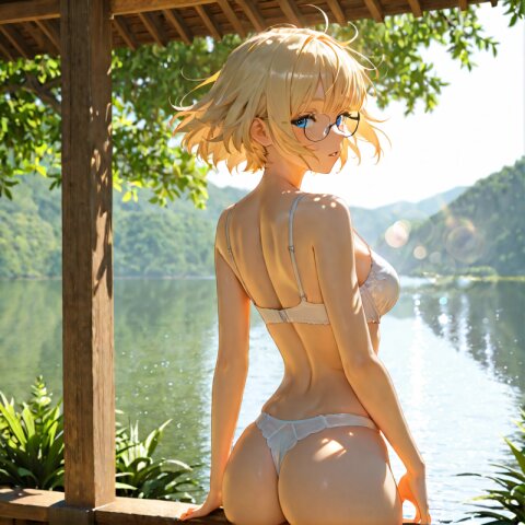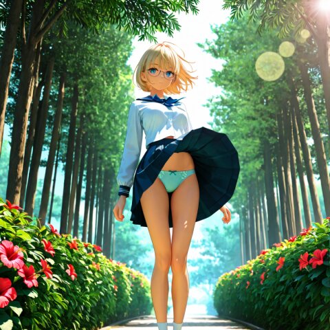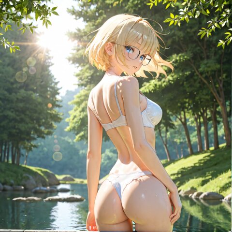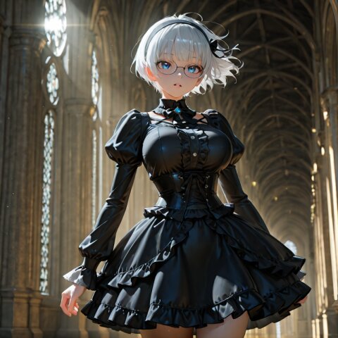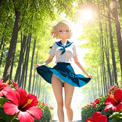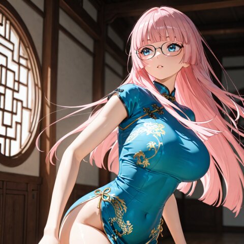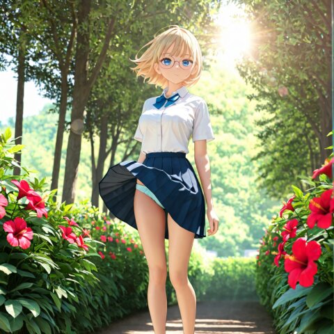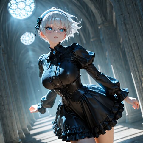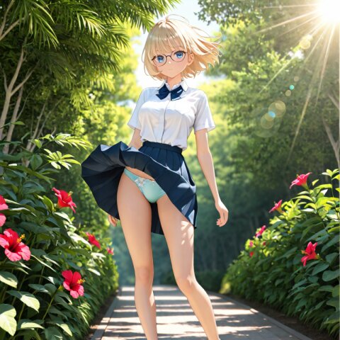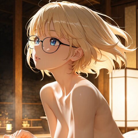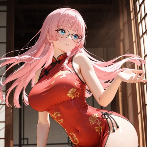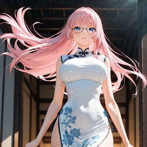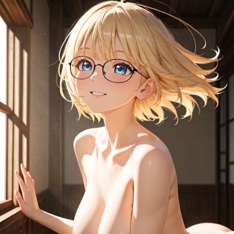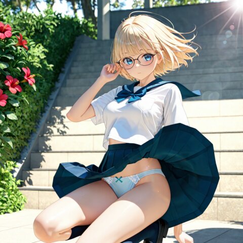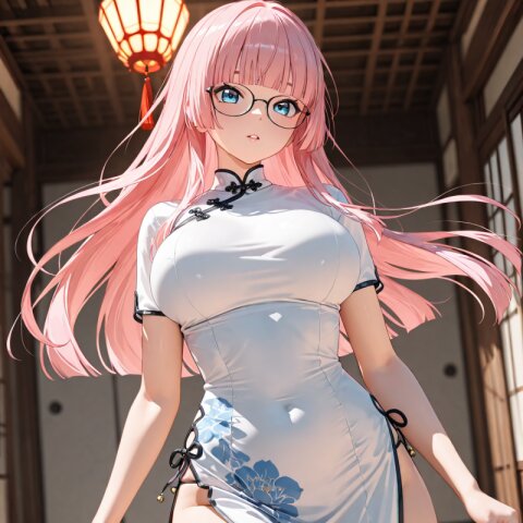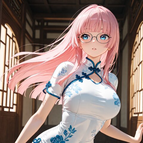 masterpiece, best quality, amazing quality, 4k, very aesthetic, high resolution, ultra-detailed, absurdres, newest, scenery, 3d, rendered, backlit, red glasses, blonde hair, short hair, choppy bangs, ;D, blue eyes, white blue, 1girl, haori, medium breasts, full body, portrait, fish eye, dynamic, modern urban renewal area, floating hair, BREAK, hands, fingers, vignetting, dramatic shadow, cinematic lighting, rim light, detailed background, depth of field, vignetting, volumetric lighting