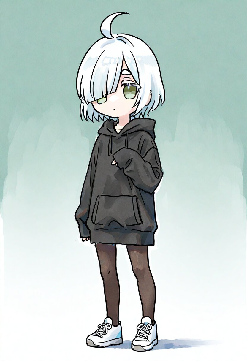 <lora:inmnstyleilxl:0.9>, best quality, masterpiece, very aesthetic, watercolor painting, general, 1girl, chibi, solo, (bright white hair), short hair, blunt bangs, white thick eyebrow, white colored eyelashes, (hair over one eye), ahoge, mintgreen eyes, oversize black hoodie, ((sleeves past wrists)), brown tights, white sneaker