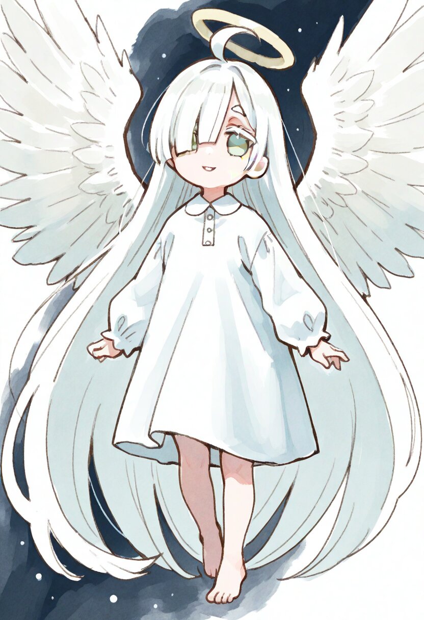 <lora:inmnstyleilxl:0.9>, best quality, masterpiece, very aesthetic, watercolor painting, general, 1girl, chibi, solo, (bright white hair), blunt bangs, white thick eyebrow, white colored eyelashes, (hair over one eye), ahoge, mintgreen eyes, absurdly long hair, white dress, long sleeves, barefoot, large white wing, halo, zero gravity, parted lips, smile