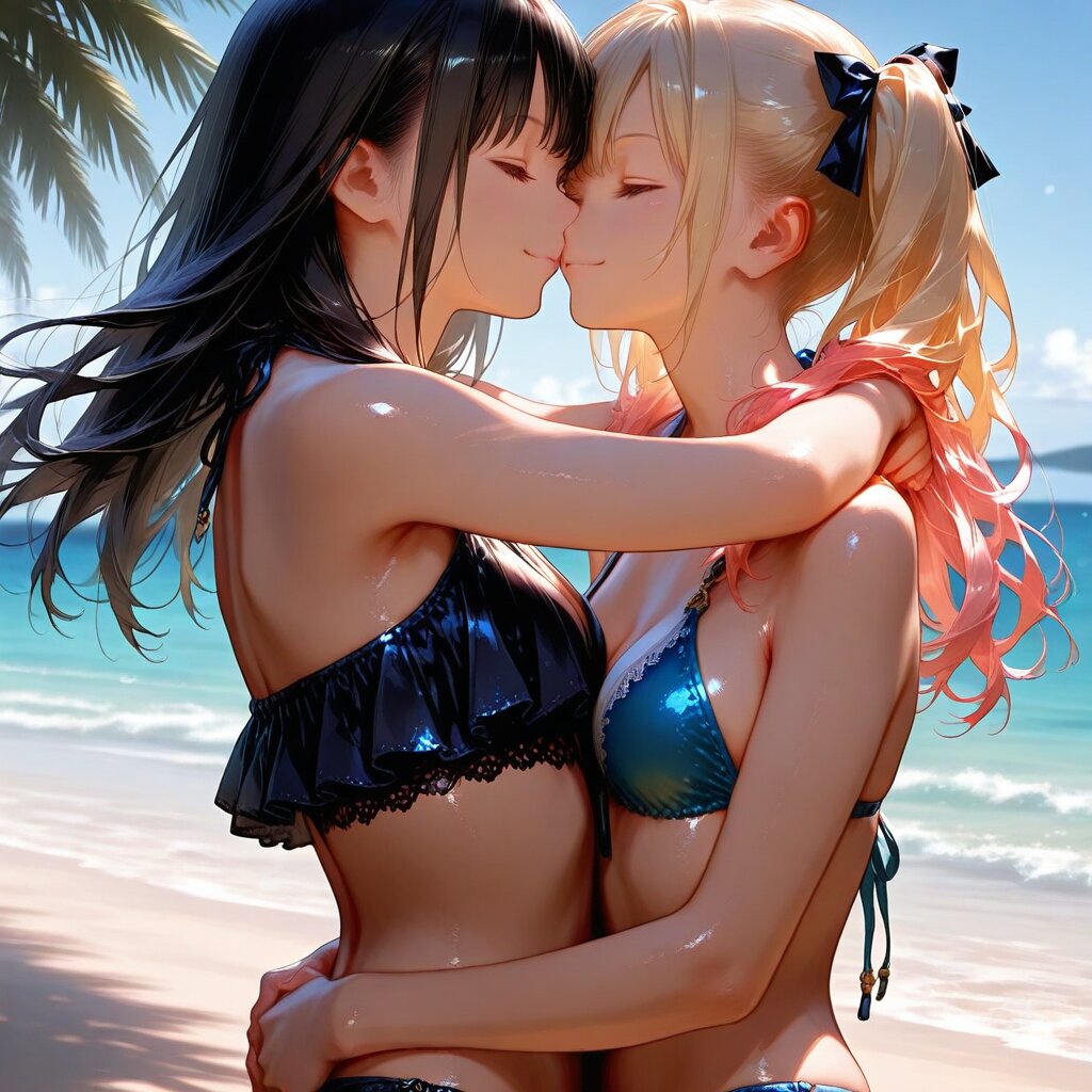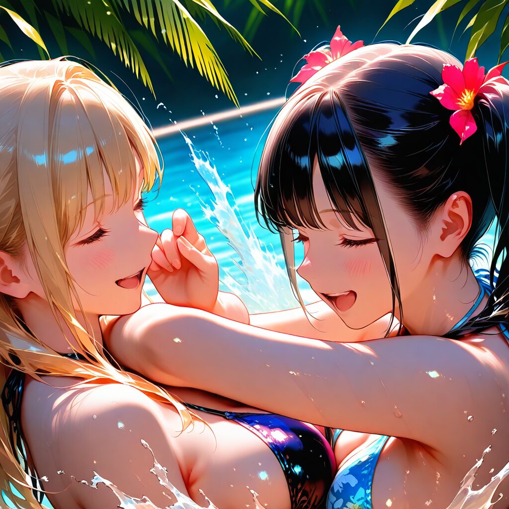 masterpiece, best quality, photorealistic, sharp focus, cinematic lighting, depth of field, beautiful composition, vibrant colors, ultra high res, 8K, highly detailed, masterpiece, best quality, very detailed, masterpiece, best quality, 2girls, yuri, blonde hair, twin tails, black hair, long hair, beautiful, bikini, playful embrace, laughing, splashing water, tropical background, joyful, dynamic pose