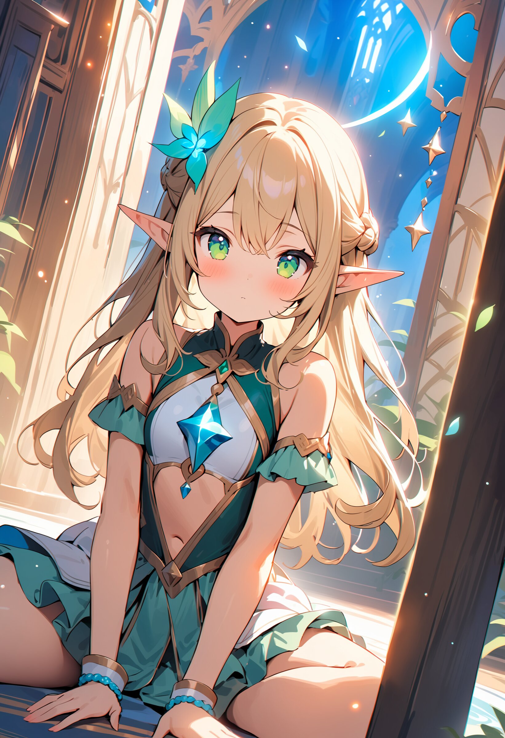 ((masterpiece)), ((best quality)), ((kawaii)), cute, (lovely), ((extremely detailed)), (beautiful), dynamic angle, sacred place, a cute girl, 1girl, solo, ((elf )),beautiful blond hair, beautiful green eyes, ((beautiful eyes)), long hair, fantasy clothes,