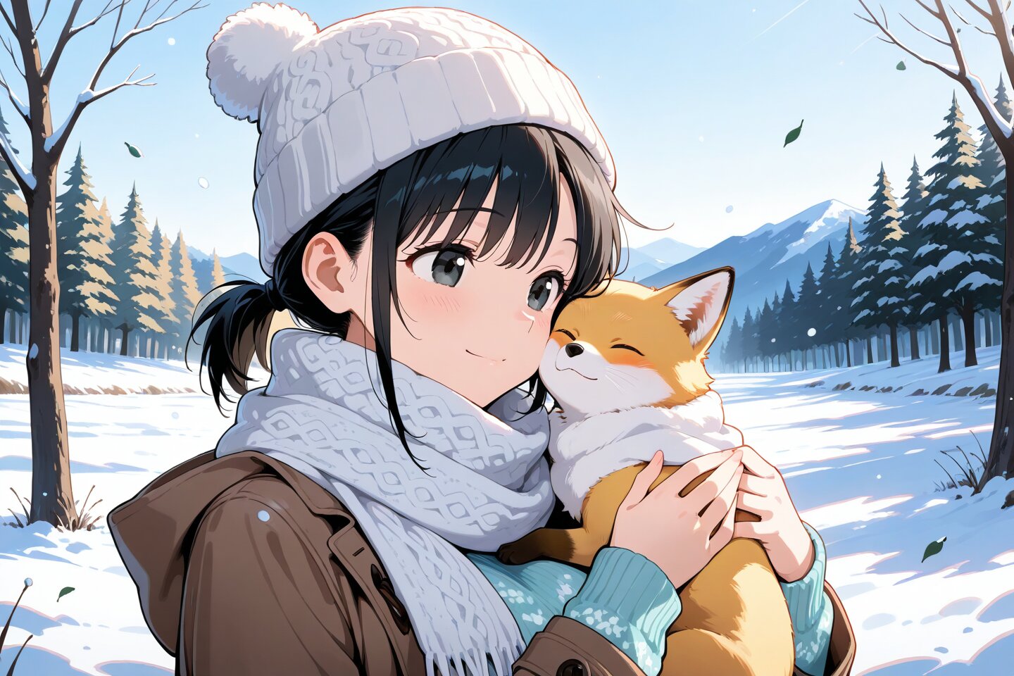 nice hands, perfect hands, perfect anatomy, perfect structure, outdoors, (1girl, solo), upper body, from front, close up eyes, The background is a winter meadow BREAK (winter outfit: a wool long coat in white or cream, a pastel-colored knit sweater with leaf patterns, a large scarf, and knit hat), young girl, beautiful face and eyes, big breasts, black hair, clear black eyes, single short ponytail hair, thin pubic hair, cute and lovely, Vigorous, lively, and spontaneous personality. hugging cute small fox cub. cheek to cheek., anime style, anime color,, masterpiece, amazing quality, very aesthetic, high resolution, ultra-detailed, absolute, newest, 2d, semi-realistic, moe heroine, sharp focus,