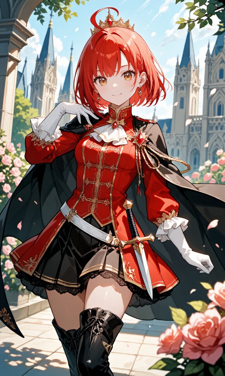 1girl, a stunning young woman with vibrant red hair styled in a short, silky smooth cut featuring a prominent ahoge, stands confidently in a (Red luxurious Prince costume:1.6) with intricate gold embroidery and ruffled cuffs. Her delicate face features large, expressive brown eyes and flawless, detailed skin that glows under the soft afternoon sunlight. She wears a (Black luxurious Cape:1.3) draped dramatically over her shoulders, a (luxurious Black mini skirt:1.4) with lace trim, and (Black luxurious boots:1.3) reaching mid-thigh. A gleaming (dagger on waist:1.3) rests at her hip, and a jeweled (crown:1.3) adorns her head, complementing her (White gloves:1.2) that extend past her elbows. She strikes a cute pose with one hand resting on her hip and the other slightly raised, exuding both charm and authority. The background features gothic architecture of a grand Palace, with towering spires and ornate stonework, surrounded by blooming flowers and dappled sunlight filtering through the trees. The romantic academia atmosphere is enhanced by the soft lighting that highlights every intricate detail of her costume and the lush environment.