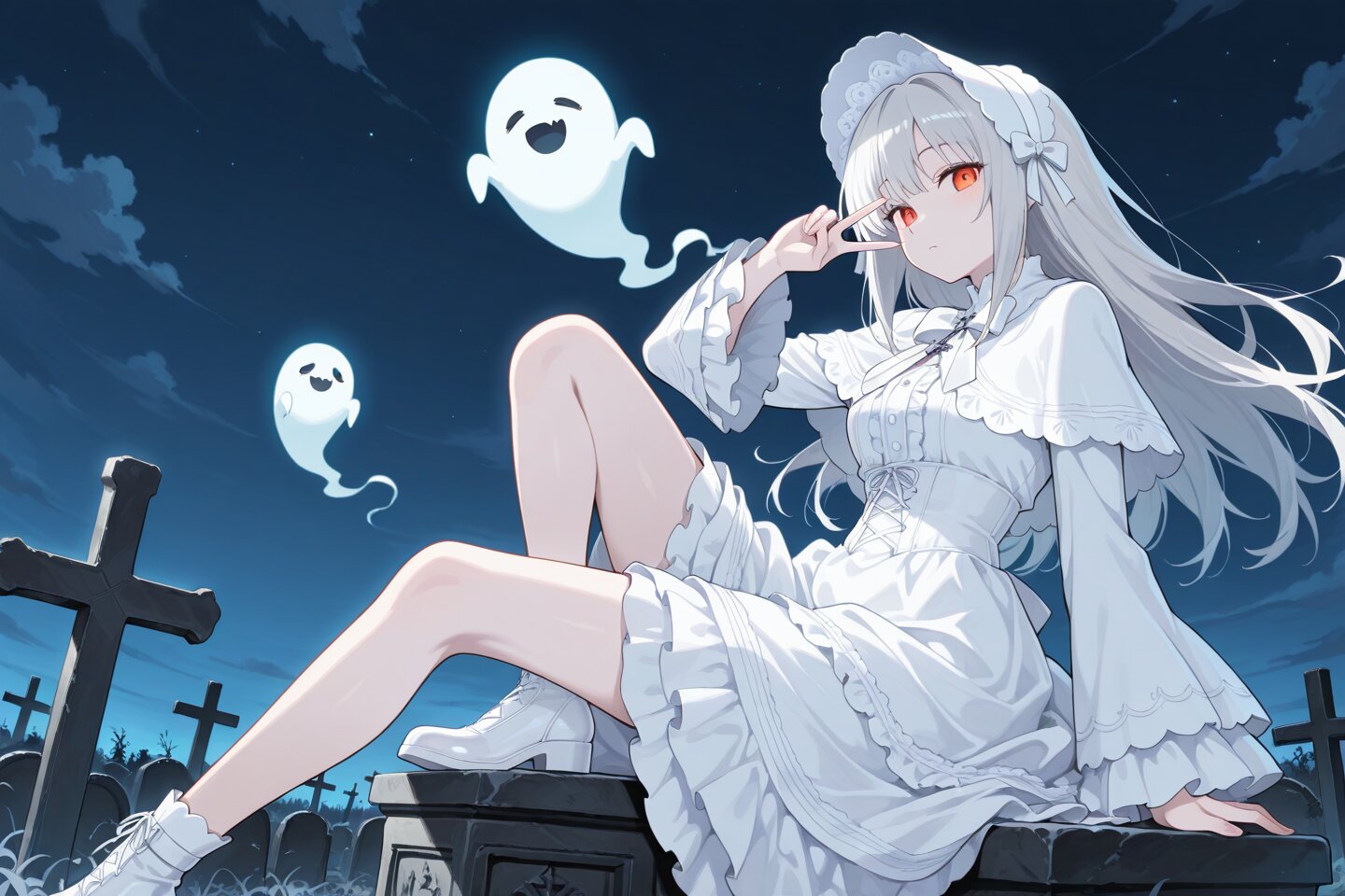 nice hands, perfect hands, perfect anatomy, perfect structure, outdoors, (1girl, solo), cowboy shot, from side, close up eyes, low angle, view from foot. The background is A deserted cemetery late at night. cross legged sitting on gravestone. lot of cute ghost floating around the girl. BREAK (winter outfit: pure white Gothic-lolita dress), ghost girl, silver hair, long hair, pale skin, orange eyes. gaze at viewer. v over eyes., anime style, anime color,, masterpiece, amazing quality, very aesthetic, high resolution, ultra-detailed, absolute, newest, 2d, semi-realistic, moe heroine, sharp focus,