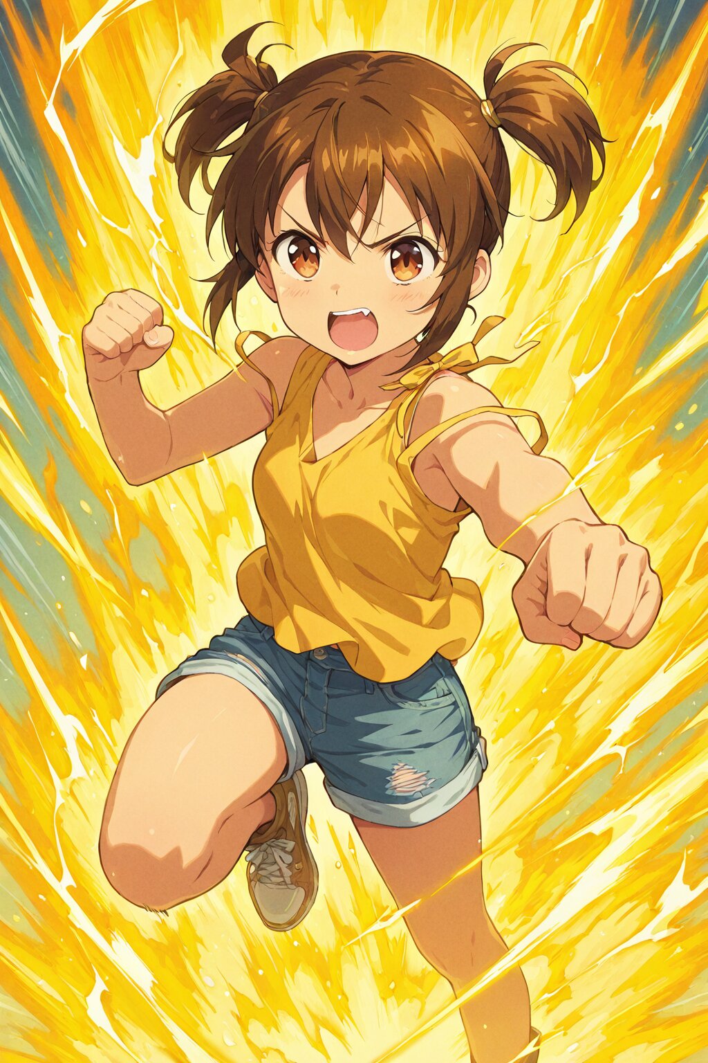 Anime-style illustration of a girl with brown short twintail hair in early summer fashion, striking a dynamic action pose. She is surrounded by vibrant, swirling aura, emphasizing her cheerful and energetic summer spirit. action,pose, 1girl, early summer fashion, anime style, anime color,, masterpiece, amazing quality, very aesthetic, high resolution, ultra-detailed, absolute, newest, 2d, semi-realistic, moe heroine, sharp focus,