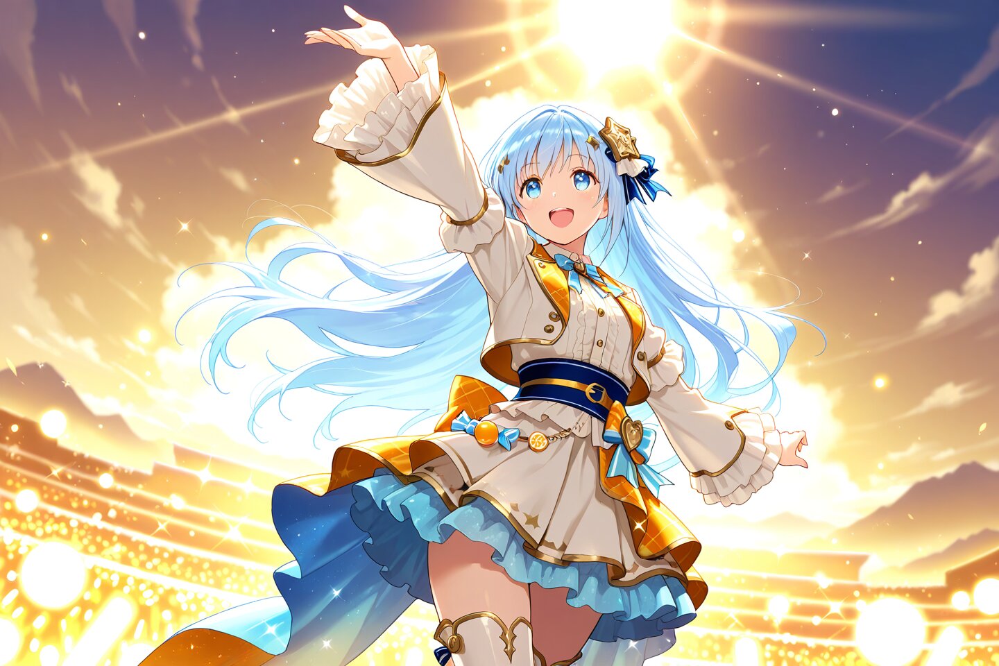 sfw:1.2. theme is Fantasy festival, background is downtown in early mourning with Fantasy decoration. outdoors. (semi-realistic, official illustration, soft lighting, cowboy shot, idol outfit, stage style, solo, standing pose), round face, childlike face, (large eyes:1.2), drooping eyes, sky blue eyes, wavy fluffy long hair, light blue hair, small build, very thin, very thin legs, cute, beautiful face, beautiful eyes, beautiful hair, best quality, ((best quality:1.5)), ((best quality eyes:1.5)), smiling, cheerful expression, modern idol costume with cookie decorations, short skirt, fitted jacket, candy motifs, candy ornaments, ribbon belt like obi, sheer white stockings, idol short boots, slightly flared sleeves, stylish silhouette, balance of western and japanese elements, white, light blue, silver, and gold color scheme, glossy satin fabric, sheer organza overlay, metallic highlights, candy hair accessory, high detail in costume texture. singing and light step dancing. reaching arm, spread arm, arm up, dynamic composition, dynamic angle, anime style, anime color,, masterpiece, amazing quality, very aesthetic, high resolution, ultra-detailed, absolute, newest, 2d, semi-realistic, moe heroine, sharp focus,, anime style, anime color, anime artwork, anime, cel anime, flat color,
