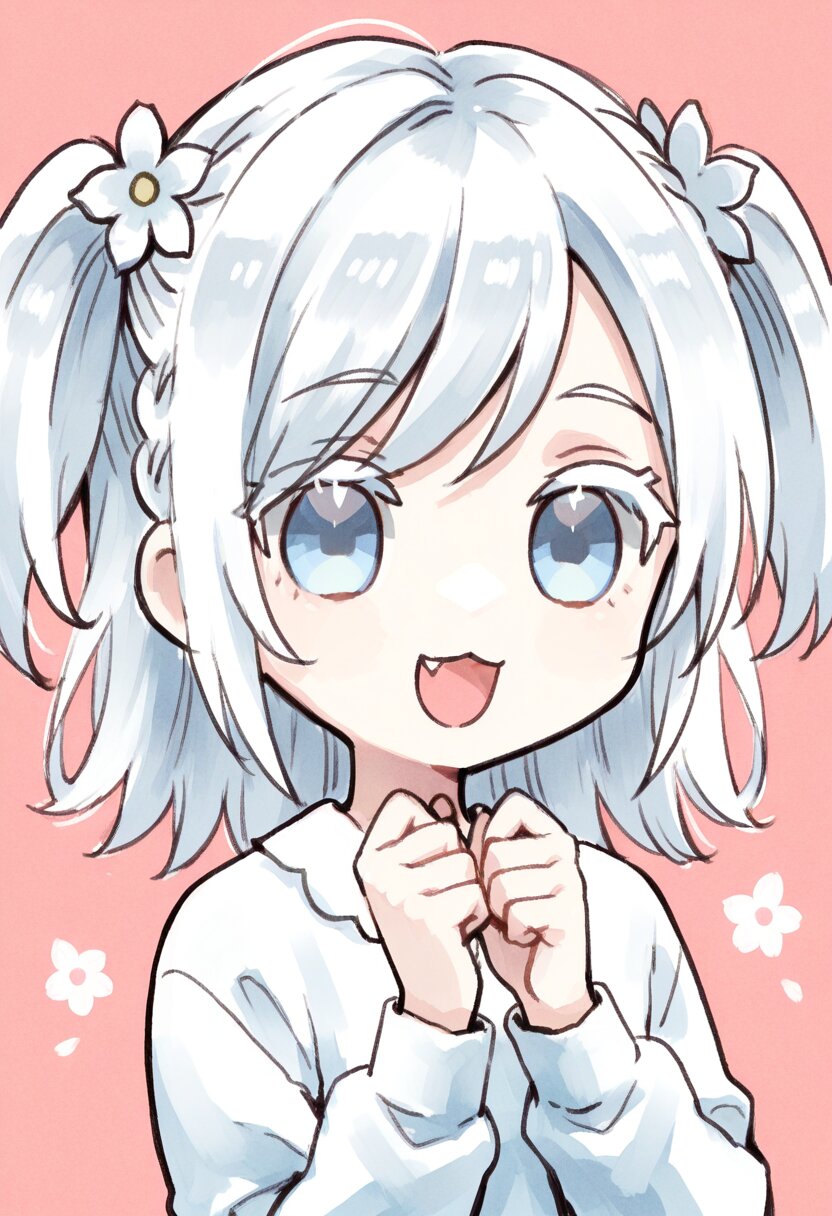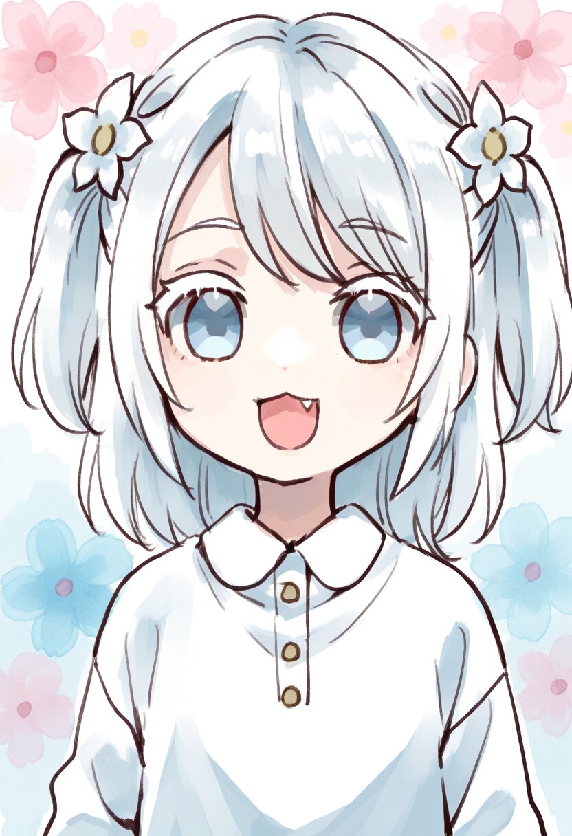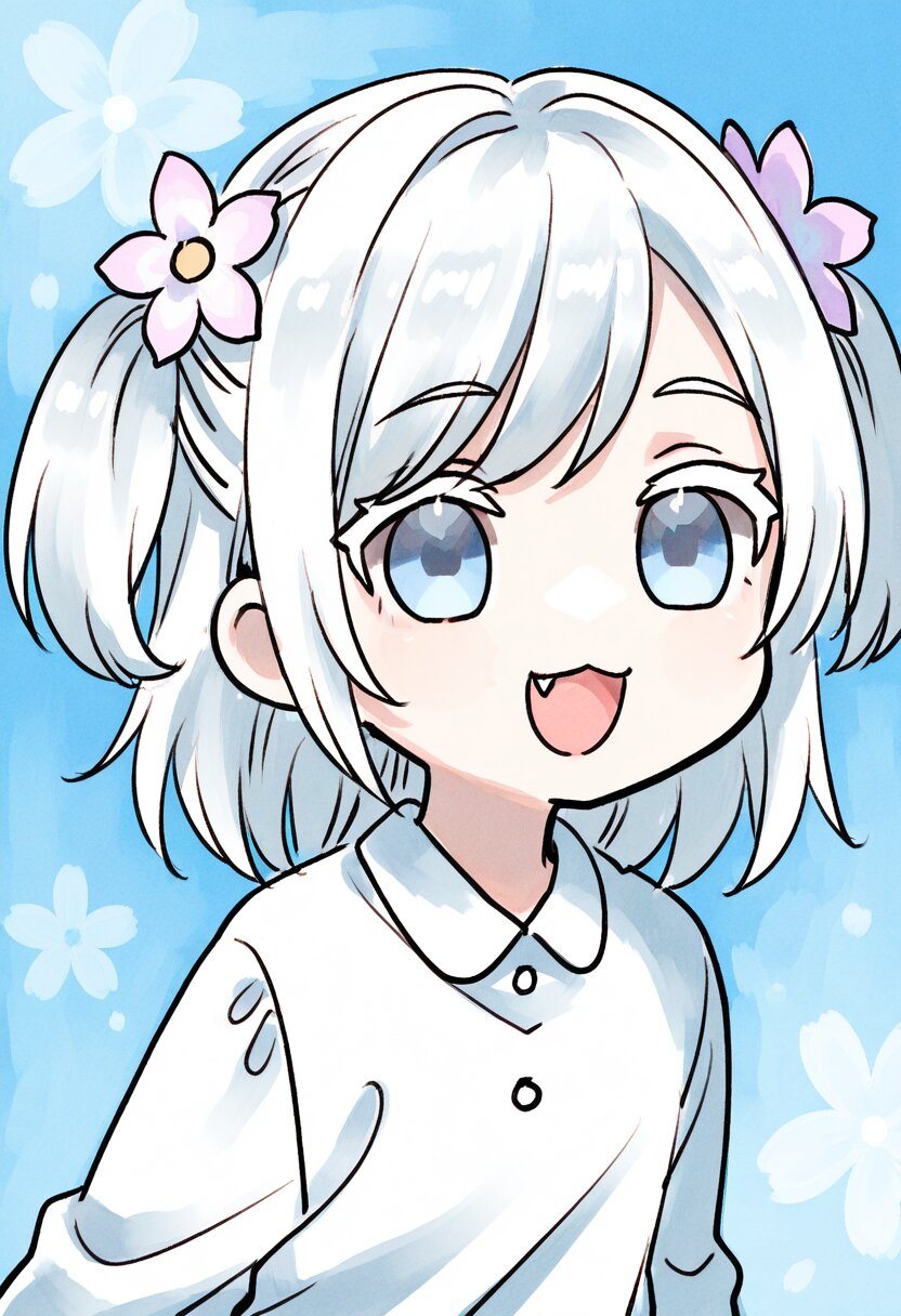 <lora:inmnstyleilxl:0.9>, best quality, masterpiece, very aesthetic, watercolor painting, general, 1girl, chibi, solo, white hair, two side up, medium hair, braid bangs, swept bangs, pale blue eyes, white colored eyelashes, :3, fang, smile, open mouth, white dress, long sleeves, portrait, flower hair ornament