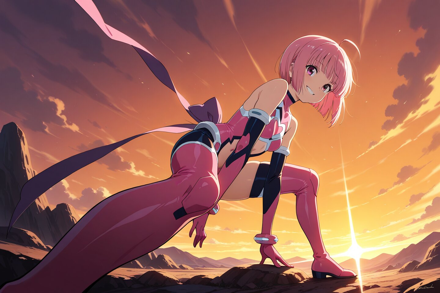 superhero landing, sheer, extreme tiny micro superhero suit, bare navel, bare shoulders, print clothing, pink print, heart print, 2d, moe heroine, dynamic composition, dynamic pose, sharp focus, outdoors, (Mischievous Smile face), (1female character, solo, no humans), (on a early Morning), gaze at viewer, low angle, from side, ahoge,hime cut, pink hair, straight hair,short hair,dark pink eyes,delicate face,detailed face,detailed skin,detailed hair,masterpiece,best quality,insanely detailed,beautiful,16K, anime style, anime color, anime artwork, anime, cel anime, flat color,, masterpiece, amazing quality, very aesthetic, high resolution, ultra-detailed, absolute, newest, 2d, semi-realistic, moe heroine, sharp focus,