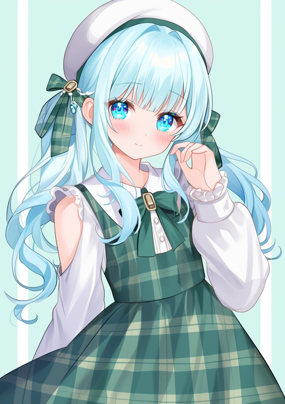 Highest quality, Absurdress, 8K, Ultra HD, Anime, One girl, Solo, Staring at the viewer, Smiling, Light blush, Soft facial features, expressive sky-blue eyes, (large expressive eyes:1.2), slightly downward-slanted eyes, long wavy fluffy hair, long twintail,light blue hair, slim build with graceful proportions, elegant silhouette, wearing an elegant checkered long-sleeved dress, green dress, stylish ribbon bolero, white fashion beret, cute and refined appearance, beautiful face, beautiful eyes, beautiful hair, highest quality, ((highest quality:1.5)), ((highest quality eyes:1.5)) ,