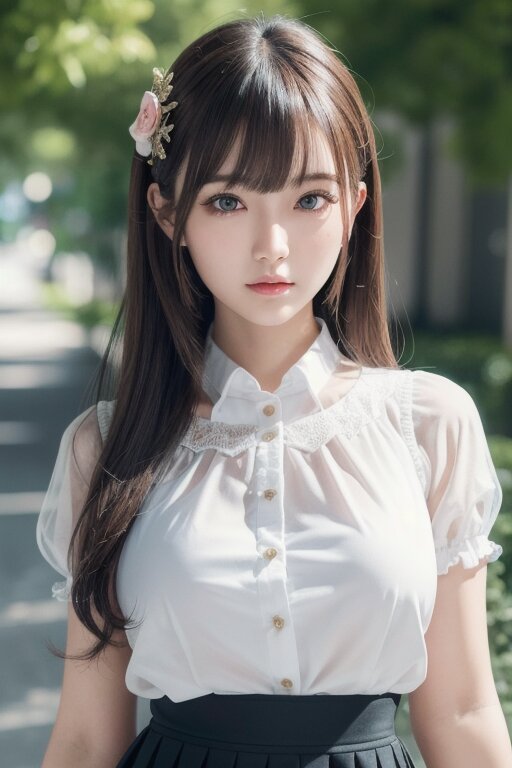 masterpiece, hyper detailed, 8K, hyper detailed illustration,extremely detailed CG, Japanese woman, 23yo, (cute:1.1), (pretty:1.1), hyper detailed face, hyper detailed eye, beautiful eye, extremely detailed, medium hair,(bangs:1.1), thin, tall, perfect anatomy, perfect proportions, extremely detailed body, blouse, short skirt, thighhighs, hyper detailed background,