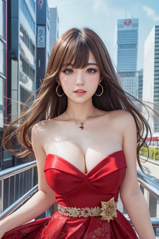 masterpiece, hyper detailed, 8K, hyper detailed illustration, full body, Japanese woman, 23yo, (cute:1.1), (pretty:1.1), hyper detailed face, hyper detailed eye, beautiful eye, medium hair, thin,tall, bangs, red dress,high high heels, hyper detailed background, city background,