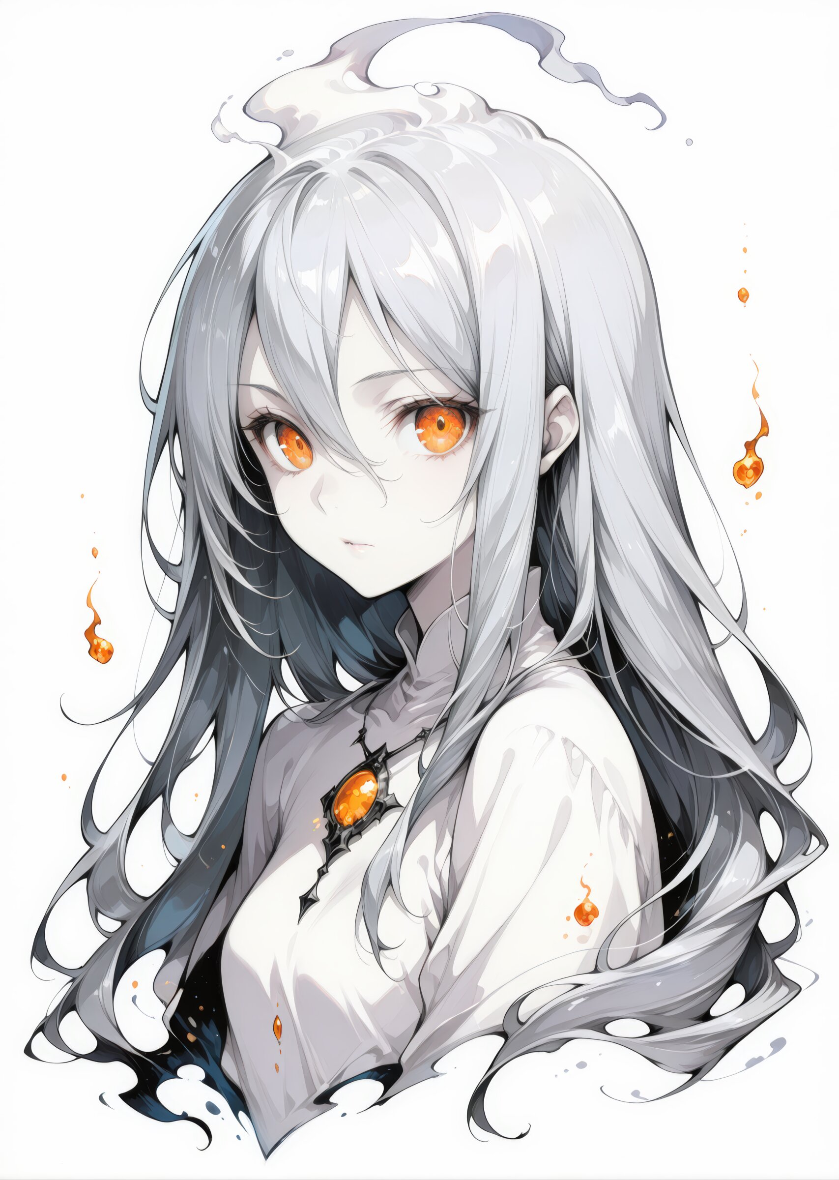 Best quality, Masterpieces, simple background, negative space, anime-style illustration, white background, fine detail, ghost girl, silver hair, long hair, pale skin, orange eyes