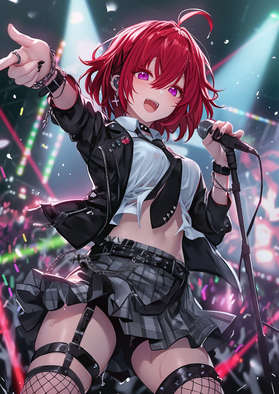 anime,from abobe,cute,1girl, slightly plump figure, (vibrant scarlet hair styled in a short bob:1.5), (silky smooth cut featuring a prominent ahoge:1.5), (portrait), spectacular scenery, dynamic angle, voluminous silhouette, punk-inspired school uniform style, black midriff blazer jacket layered over a white collared shirt exposing the abdomen, clearly defined blazer and shirt structure, black blazer with punk-style silver chain decoration (short shirt revealing abdomen, cropped open jacket), black long sleeves layered over black-and-white cuffs, white collared shirt paired with long tie (black long tie), tie featuring (cross motif) and hanging long toward torso, black eyelet belt with silver chain detail, black belt with punk accessories, low-rise (gray check pleated skirt), mini A-line skirt, gray skirt hem with black scallop lace trim, upper thigh exposure, (lace-trimmed black thigh-high socks), extra-long socks, black platform boots, head tilt, (dance pose: 1.3), (singing: 1.3), jump, holding mic, pointing at audience, giant screen, spotlight, live stage, (confetti: 1.3), colorful laser beams, (glowing musical notes flying: 1.3), Crowd silhouettes, wet skin, boyish earrings, boyish nails, boyish bracelet, motion lines, speed lines, motion blur effect,