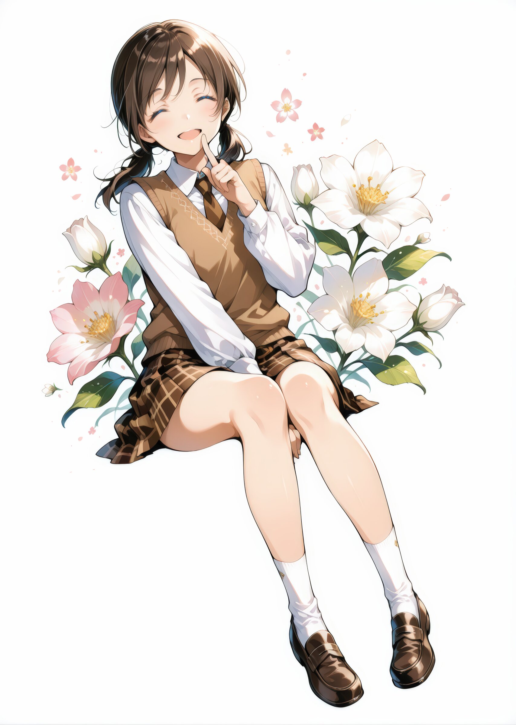 Best quality, Masterpieces, simple background, negative space, anime-style illustration, white background, fine detail, 1girl, small body, brown shorthair, low twintail, dark blue eyes, smile, open mouth, closed eyes, White long-sleeved collared mandarin shirt, brown necktie, brown sleeveless vest over shirt, brown checkered skirt, white socks, loafers, put index finger on mouth, Sitting with legs extended, dutch angle, floral scent background, soft pink and white flowers, minimal design, airy and delicate